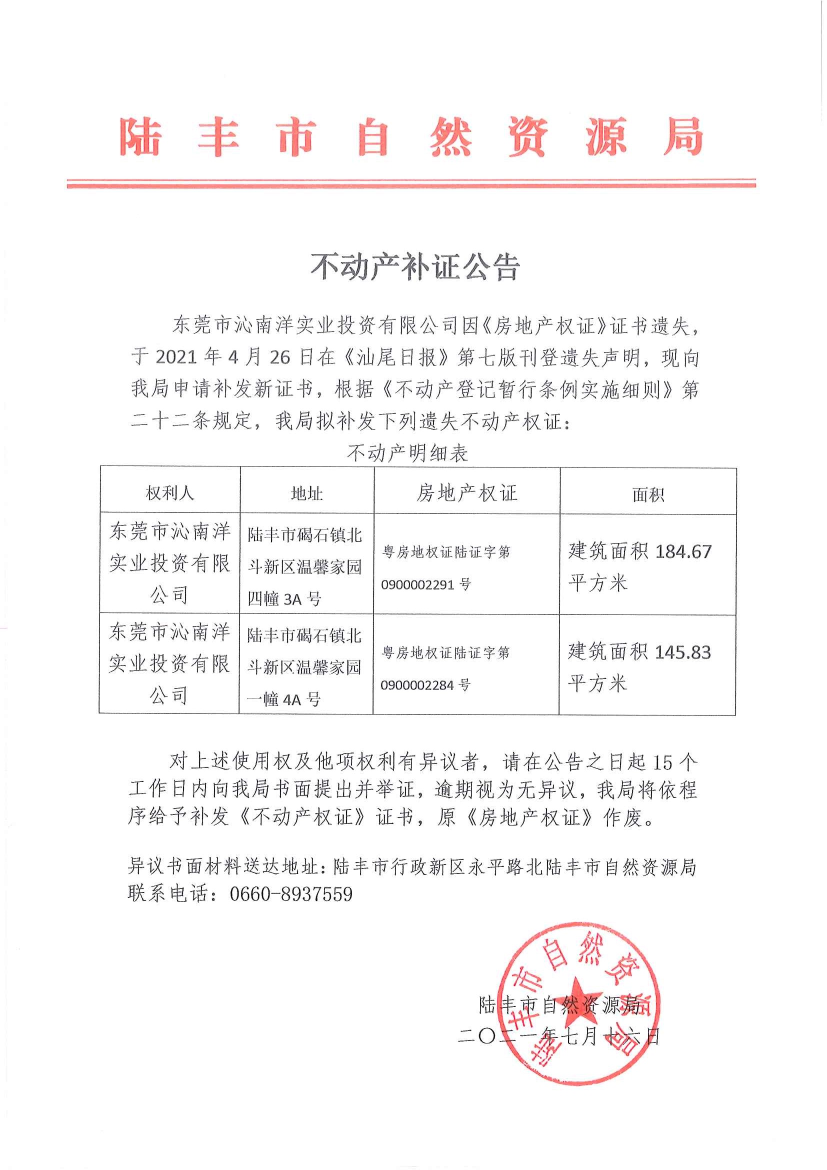 不動產(chǎn)補證公告(東莞市沁南洋實業(yè)投資有限公司)