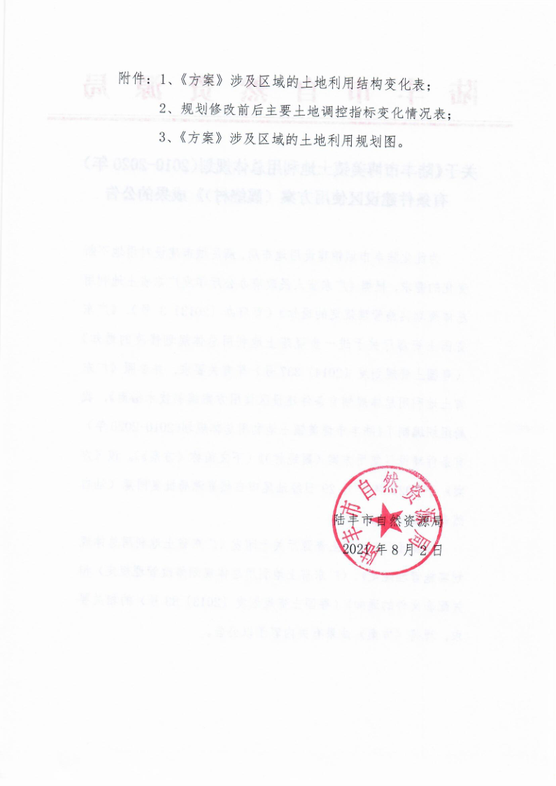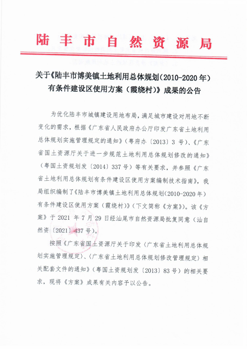關(guān)于《陸豐市博美鎮(zhèn)土地利用總體規(guī)劃(2010-2020年)有條件建設(shè)區(qū)使用方案(霞繞村)》成果的公告