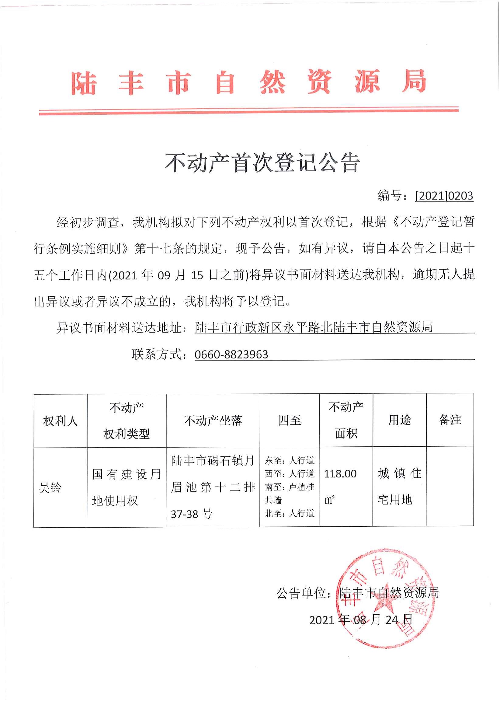 不動產(chǎn)首次登記公告(吳鈴)