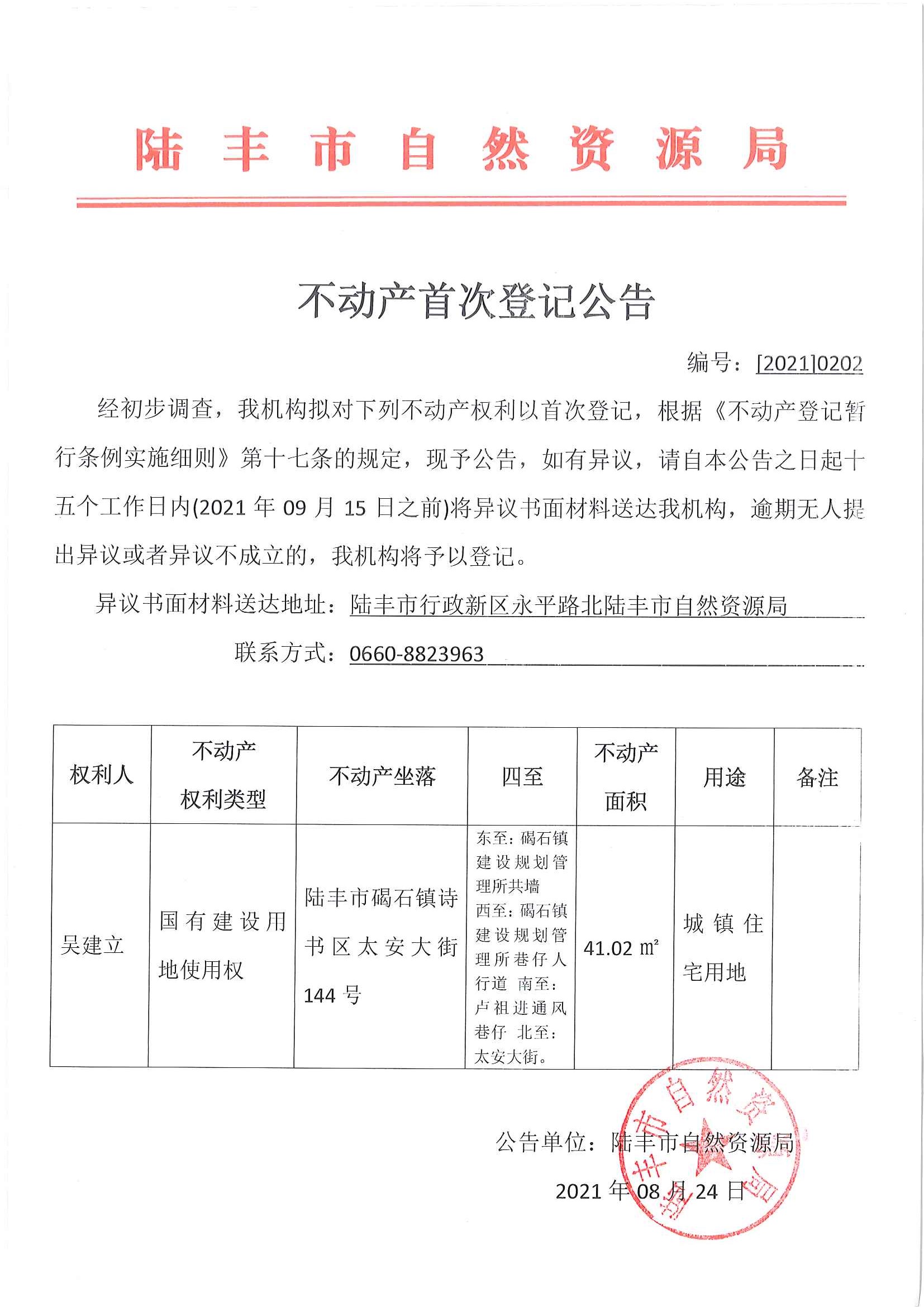 不動產(chǎn)首次登記公告(吳建立)