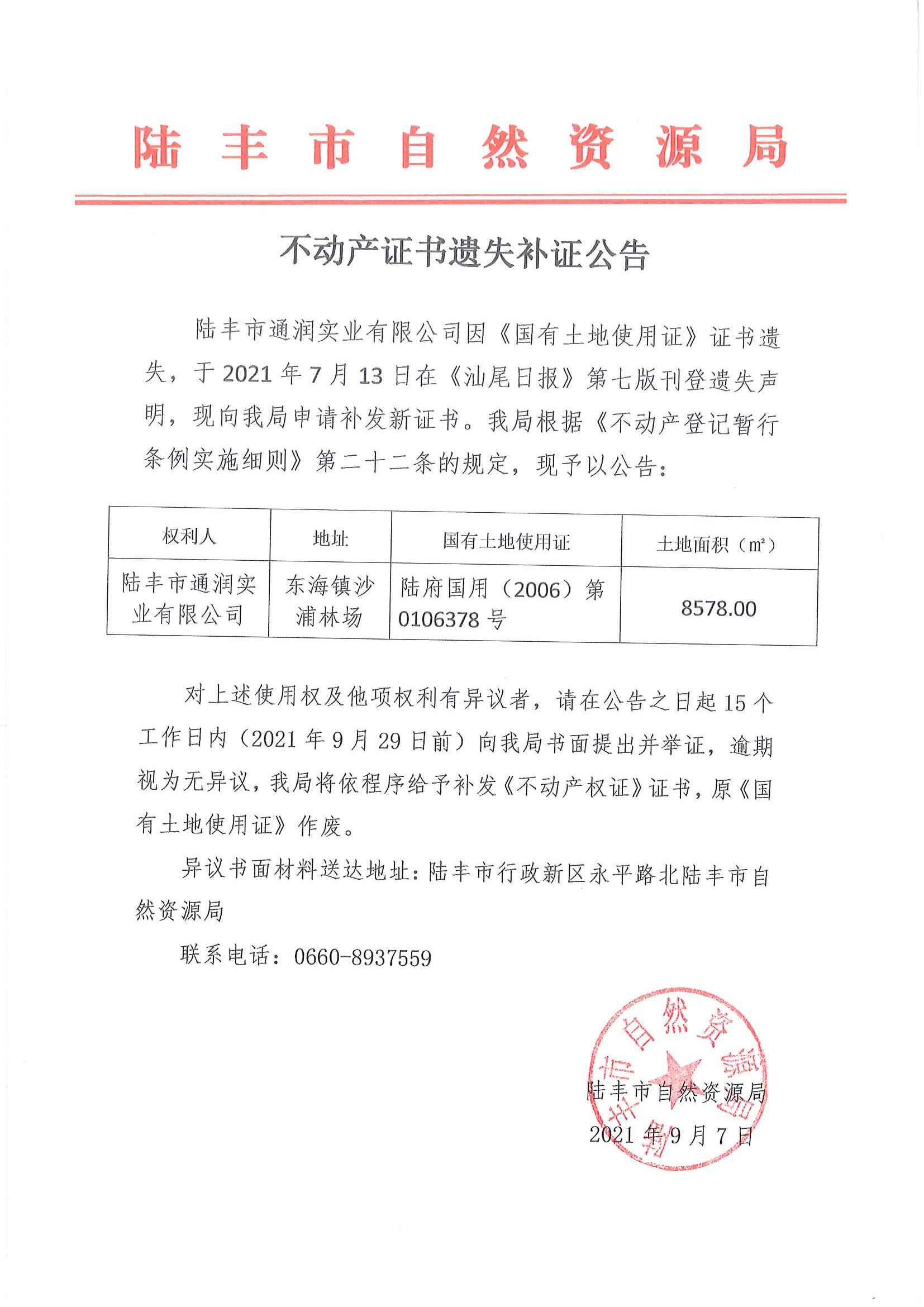 不動產(chǎn)證書遺失補證公告(陸豐市通潤實業(yè)有限公司)