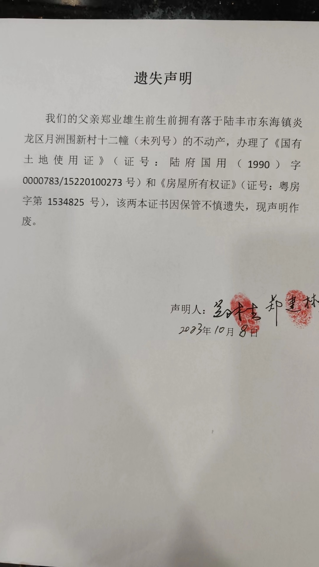因下列不動(dòng)產(chǎn)權(quán)經(jīng)繼承公告逾期無異議,由繼承人鄭木生、鄭建彬共同繼承,因證書遺失,根據(jù)《不動(dòng)產(chǎn)登記暫行條例實(shí)施細(xì)則》第二十二條的規(guī)定,現(xiàn)公告作廢,如有異議,請(qǐng)自本公告之日起十五個(gè)工作日內(nèi)(2023年11月23日之前)將異議書面材料送達(dá)我機(jī)構(gòu),逾期無人提出異議或者異議不成立的,我機(jī)構(gòu)將予以辦理轉(zhuǎn)移(繼承)登記。