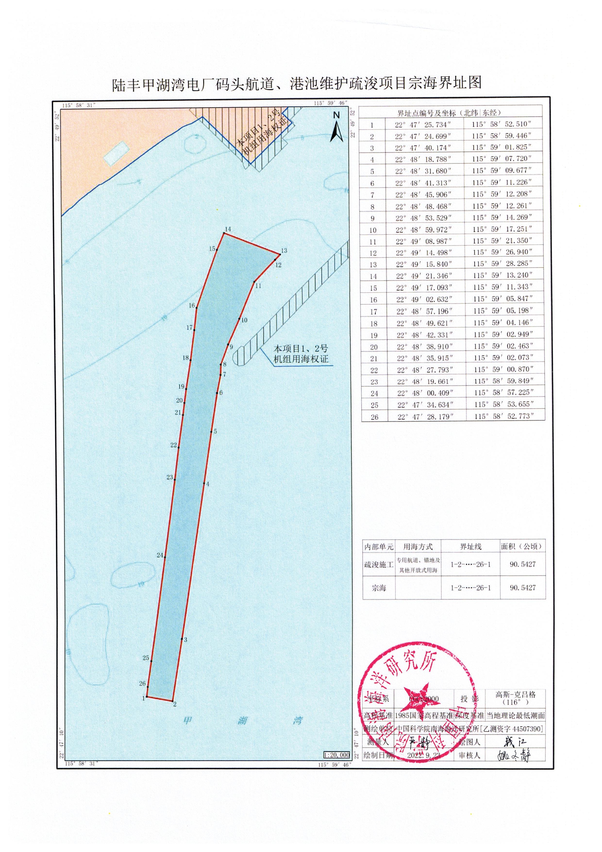 一、陸豐甲湖灣電廠碼頭航道、港池維護性疏浚項目位于陸豐市湖東鎮(zhèn)陸豐甲湖灣電廠海甲山西側海域擬申請使用海域,用海面積90.5427 公頃,用海類型為工業(yè)用海中的電力工業(yè)用海,用海方式為開放式用海中的專用航道、錨地及其它開放式用海,申請用海期限為2.5個月,具體界址點及坐標見附件。