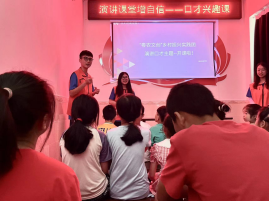 此次主題活動共有三個環(huán)節(jié)。首先是志愿者們?yōu)閷W(xué)生們帶來精彩的演講小課堂。他們通過簡單的口部操、開聲、氣息練習(xí)、普通話四聲歌、簡單的繞口令開展演講口才授課。
