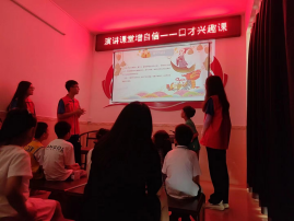 學(xué)生們在志愿者的帶領(lǐng)下找準(zhǔn)節(jié)奏感,辨別出平翹舌、前后鼻音,志愿者們細(xì)心地發(fā)現(xiàn)學(xué)生們普通話的缺陷并給予糾正,幫助小朋友們更熟練地使用普通話,提升口才能力。