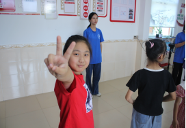 “1234、2234,握緊你的小拳頭,跟我一起動起來…”志愿者一個八拍一個八拍地進(jìn)行舞蹈教學(xué)。安靜的小學(xué)生學(xué)跳舞的時候動作也能放得開,在十五分鐘內(nèi)都學(xué)會了《嚕啦啦快樂舞》。