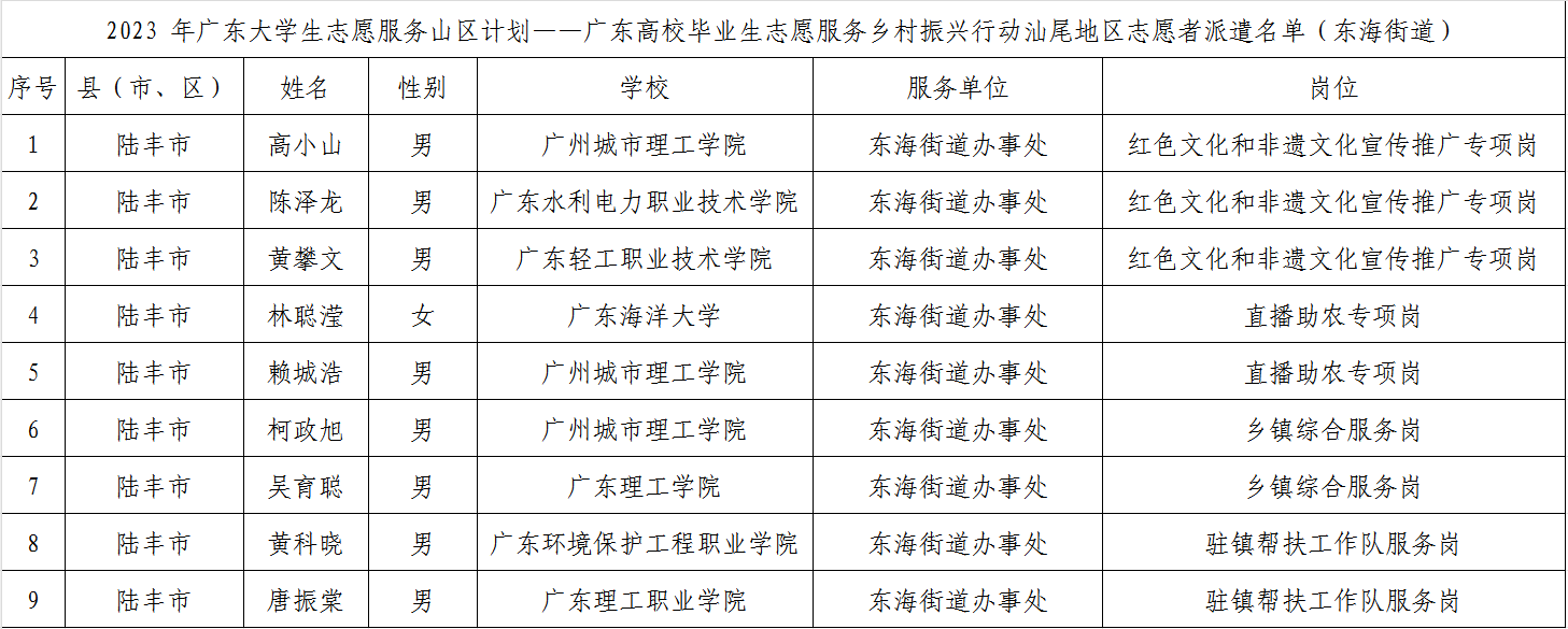 2023 年廣東大學(xué)生志愿服務(wù)山區(qū)計(jì)劃——廣東高校畢業(yè)生志愿服務(wù)鄉(xiāng)村振興行動(dòng)汕尾地區(qū)志愿者派遣名單(東海街道)