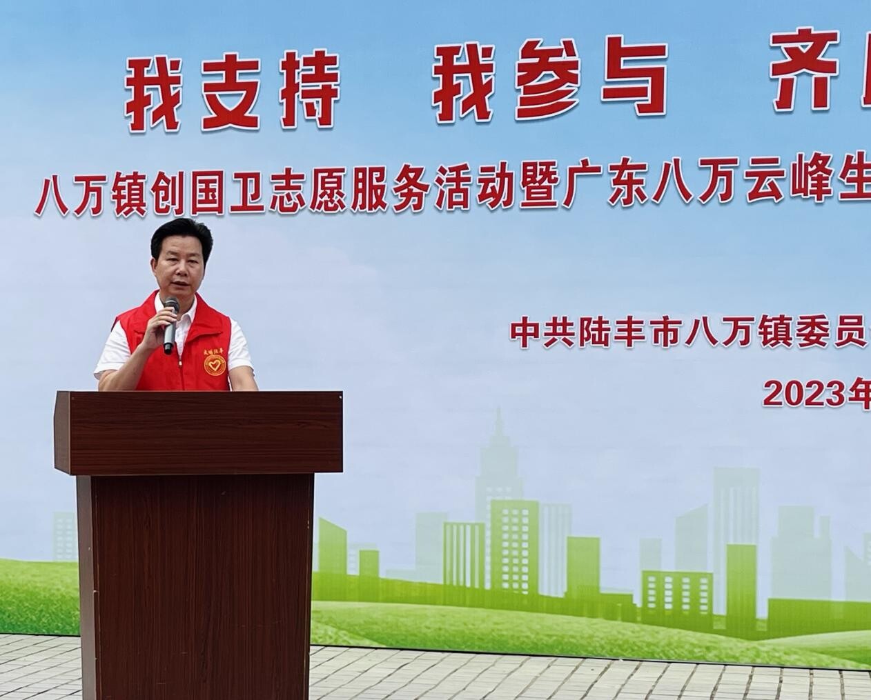 “我支持,我參與,齊心協(xié)力爭創(chuàng)國家衛(wèi)生鎮(zhèn)”,11月11日,八萬鎮(zhèn)舉行創(chuàng)國衛(wèi)志愿服務活動暨廣東八萬云峰生態(tài)文化發(fā)展有限公司捐贈環(huán)衛(wèi)保潔車輛交接儀式。