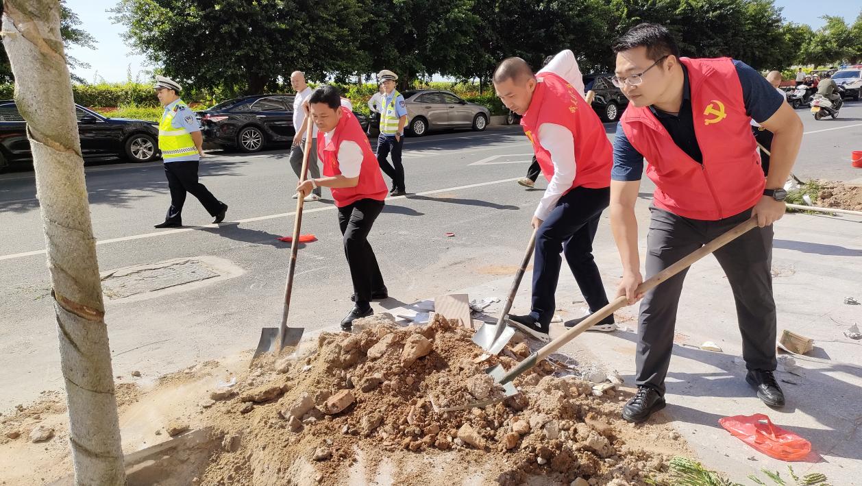 活動(dòng)現(xiàn)場(chǎng),或三人一組,或五人一隊(duì),徐鴻亮同志帶領(lǐng)眾人揮鍬鏟土、扶苗培土、夯實(shí)土層。挖坑、扶苗、壓土、澆水,各環(huán)節(jié)銜接有序,配合默契,現(xiàn)場(chǎng)一片繁忙有序、干勁十足的景象。歷經(jīng)2個(gè)小時(shí)的辛勤勞作,一株株香樟樹、鳳凰樹、鐵刀木樹苗錯(cuò)落有致,迎風(fēng)挺立,煥發(fā)出無(wú)限生機(jī)與活力。