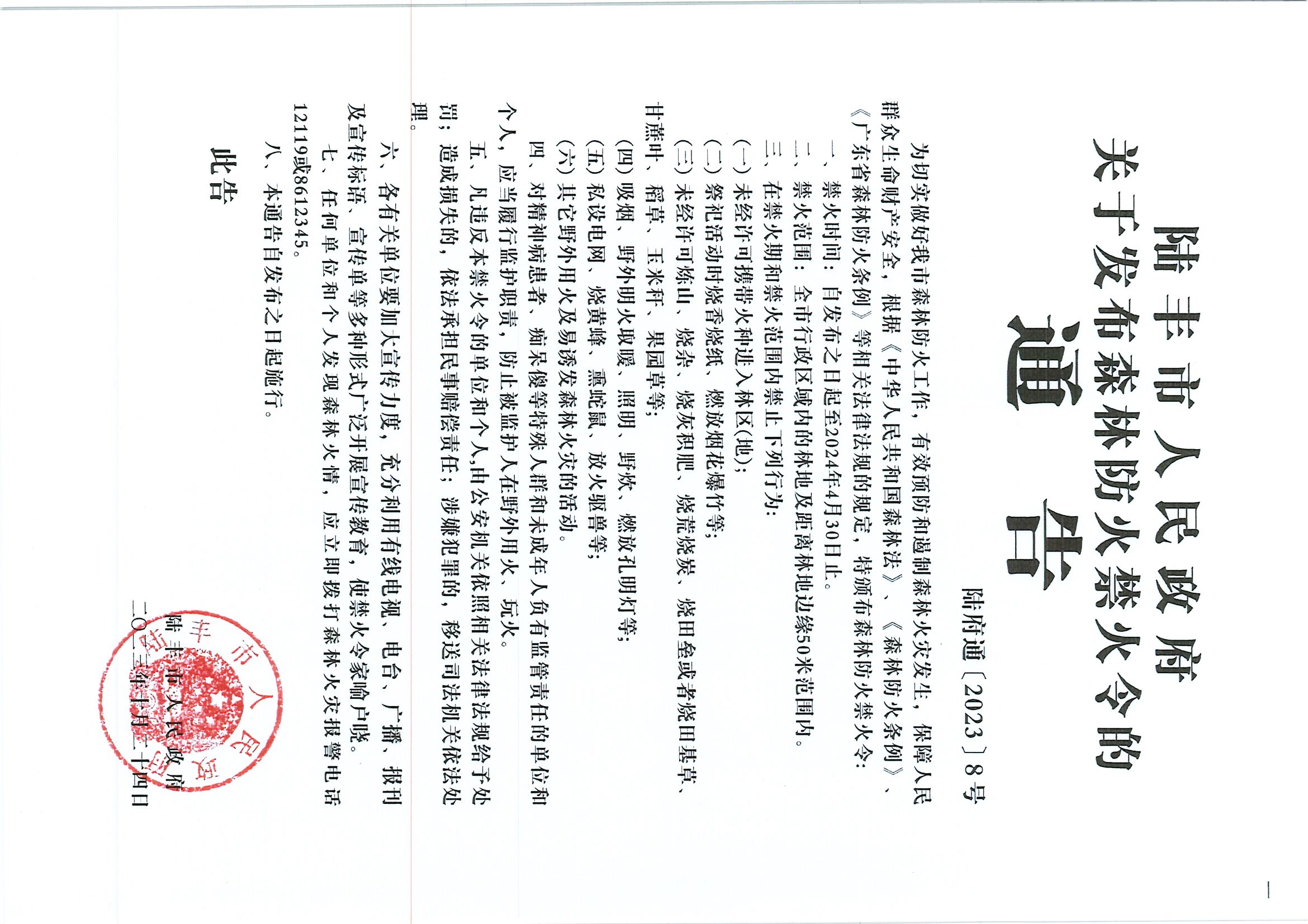 陸豐市人民政府關于發(fā)布森林防火禁火令的通告