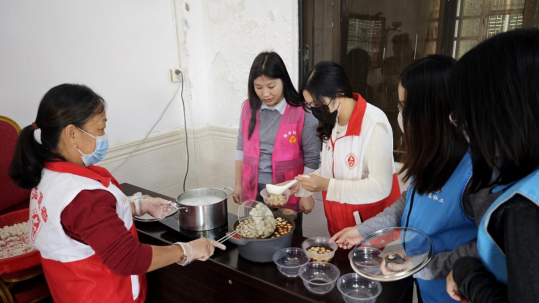 活動(dòng)現(xiàn)場(chǎng),鎮(zhèn)、村志愿者分工協(xié)作,揉面團(tuán)、調(diào)餡料、包菜包粿、搓湯圓,動(dòng)作嫻熟又充滿笑意。不一會(huì)兒,一個(gè)個(gè)飽滿的菜包粿、圓滾滾的湯圓便擺滿了盆碟;經(jīng)過(guò)蒸煮,香氣四溢的美食被細(xì)心分裝成一份份愛(ài)心餐盒。