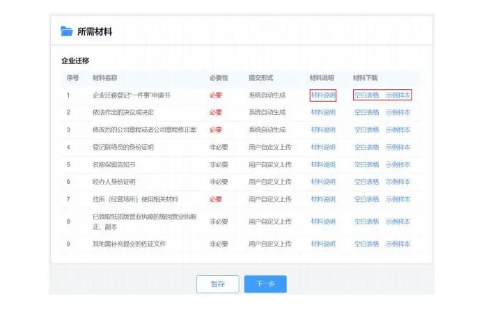 系統(tǒng)根據(jù)辦理場景展示需提交的文書材料,其中企業(yè)遷移需要上傳下圖中的材料,住房公積金遷移、稅務(wù)遷移、社保遷移無需上傳材料。點(diǎn)擊“材料說明”、“示例樣本”、“空白表格”,可查看該項(xiàng)材料的說明和下載模板。點(diǎn)擊“下一步”按鈕,進(jìn)入企業(yè)遷移登記填報(bào)頁面。
