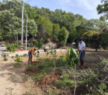 垃圾清理完成后,參與人員迅速投入植樹(shù)活動(dòng)。根據(jù)山林生態(tài)特點(diǎn),科學(xué)規(guī)劃種植區(qū)域,選取適宜本地生長(zhǎng)的芒果樹(shù) 48 株。在指導(dǎo)下,大家分工明確,揮鍬鏟土、扶苗填坑、澆水固根,經(jīng)過(guò)數(shù)小時(shí)努力,一排排新苗整齊挺立,為山林增添生機(jī)與綠意。
