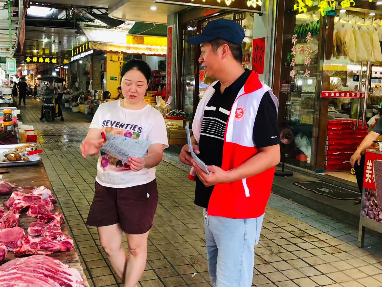為確保重點區(qū)域防控無死角,志愿者走進市場,向攤主與顧客普及防控知識。在市場內,志愿者與攤主親切交流,了解日常經(jīng)營情況,并發(fā)放宣傳資料。市場內人來人往,攤位上擺滿新鮮蔬菜與肉類,志愿者與群眾互動頻繁,現(xiàn)場氣氛活躍。