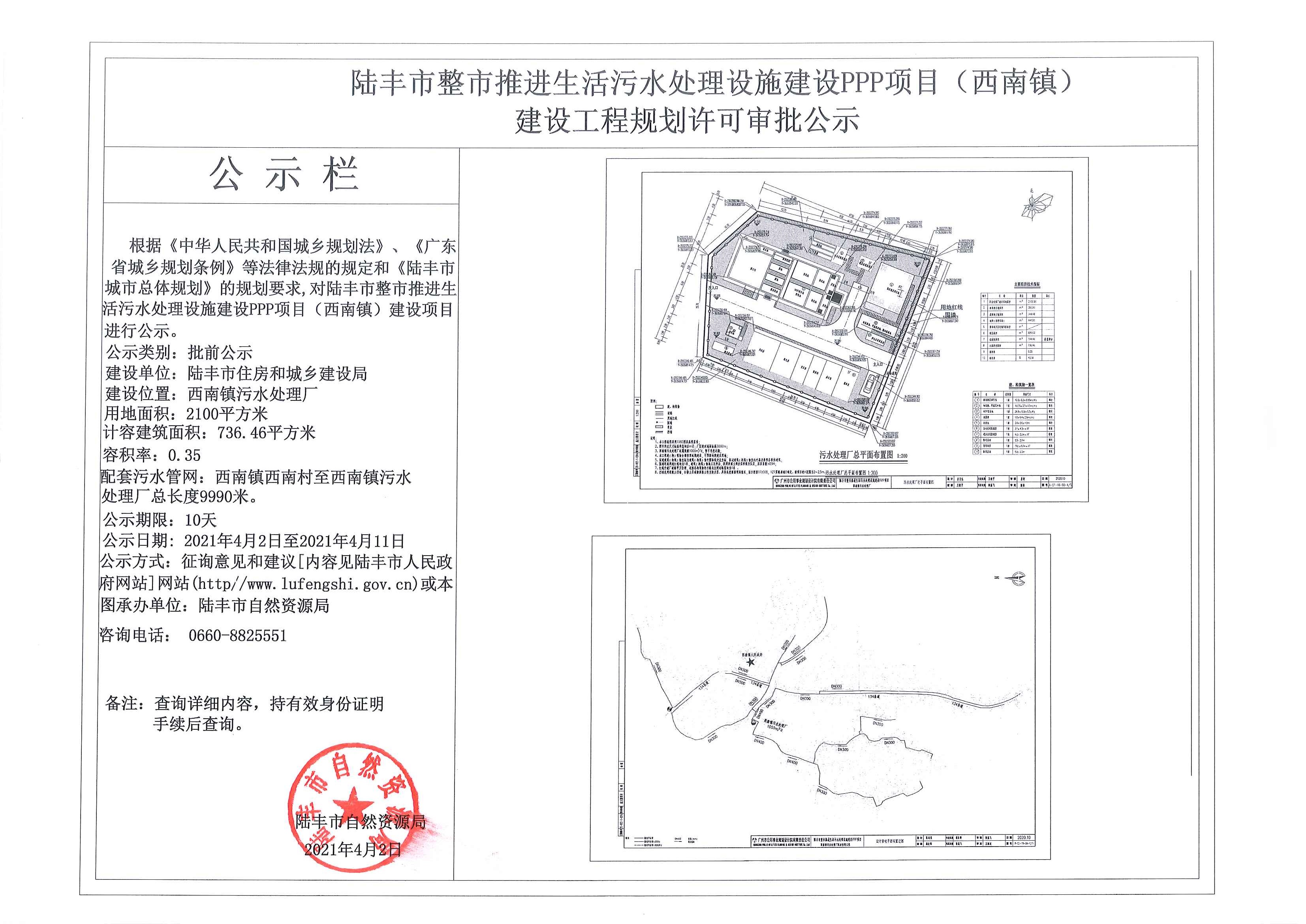 陸豐市整市推進(jìn)生活污水處理設(shè)施建設(shè)PPP項(xiàng)目(西南鎮(zhèn))建設(shè)工作規(guī)劃許可審批公示