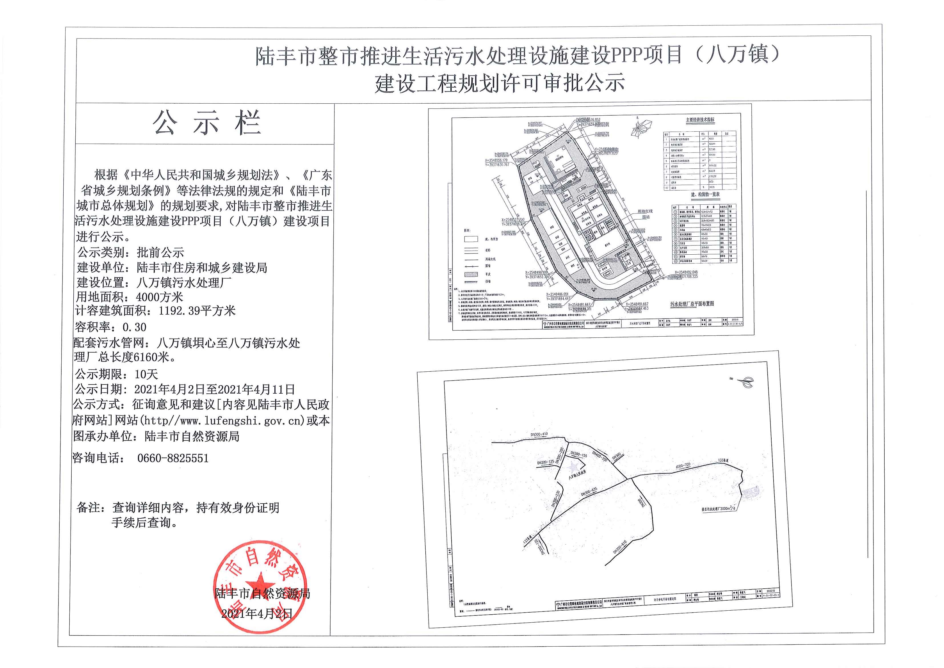 陸豐市整市推進(jìn)生活污水處理設(shè)施建設(shè)PPP項目(八萬鎮(zhèn))建設(shè)工作規(guī)劃許可審批公示