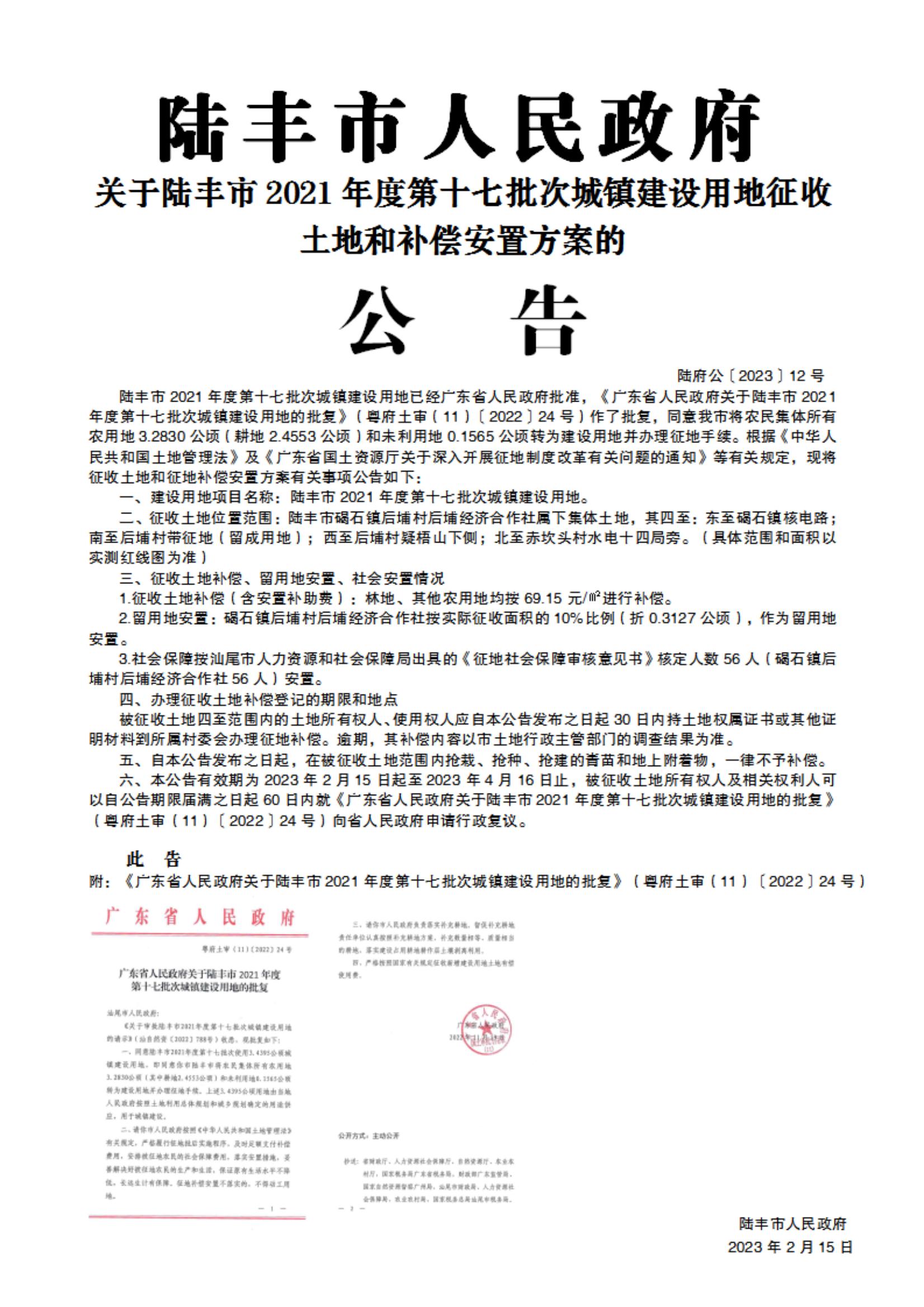 廣東省人民政府關于陸豐市2021年度第十七批次城鎮(zhèn)建設用地的批復(粵府土審(11)〔2022〕24號)