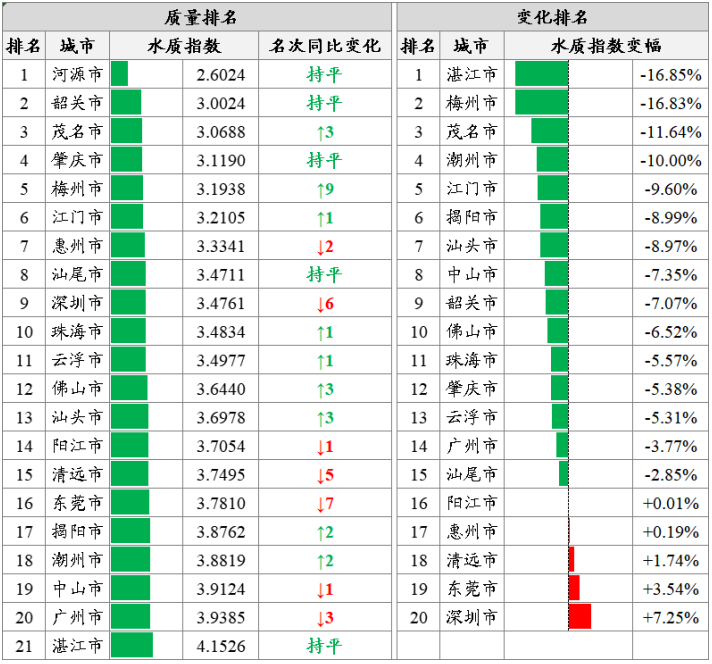 城市排名:基于270個(gè)省考斷面水質(zhì)監(jiān)測(cè)結(jié)果,按照城市水質(zhì)指數(shù)由低到高排名,全省水環(huán)境質(zhì)量前三名為河源、韶關(guān)和茂名市,后三名由高到低為湛江、廣州和中山市。湛江、梅州和茂名等15市水環(huán)境質(zhì)量同比有所改善,深圳、東莞和清遠(yuǎn)等5市同比有所下降(河源市所有省考斷面均達(dá)到水質(zhì)目標(biāo)且均達(dá)到或優(yōu)于Ⅱ類,不參與水質(zhì)變化排名)。