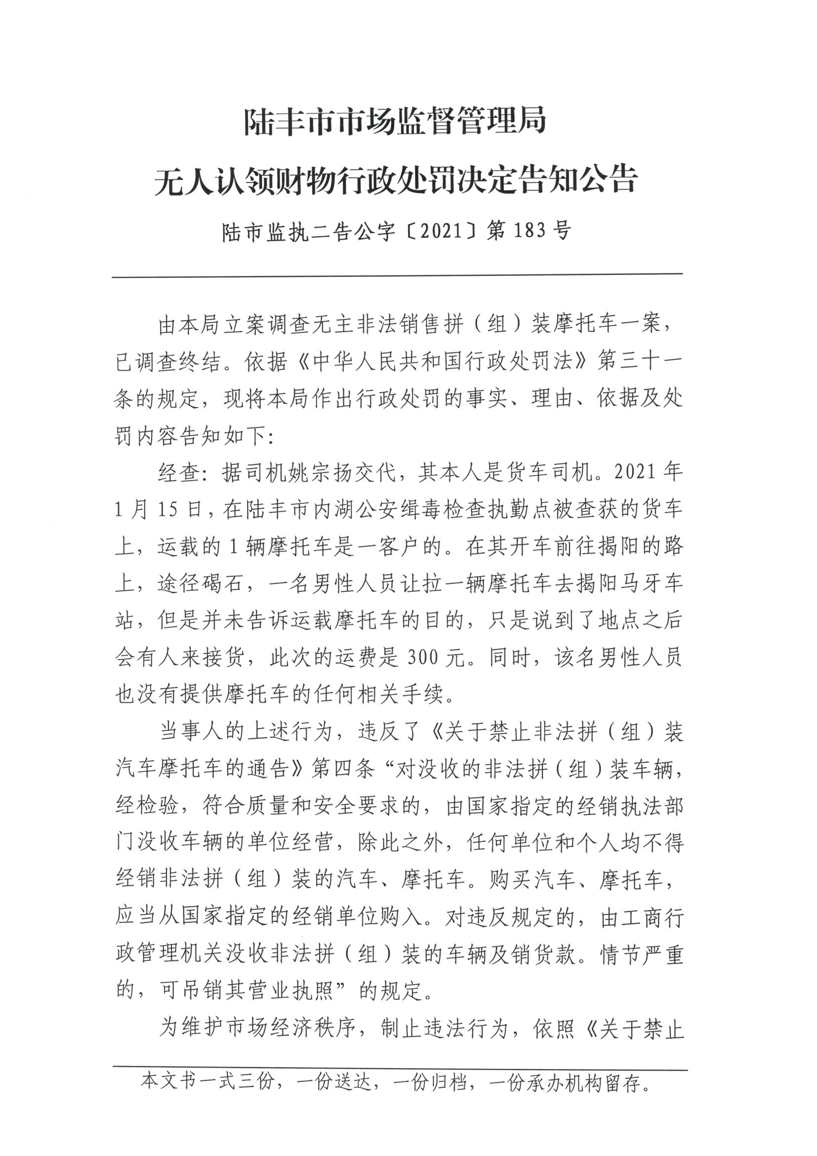 陸豐市市場監(jiān)督管理局無人認領財物行政處罰決定告知公告