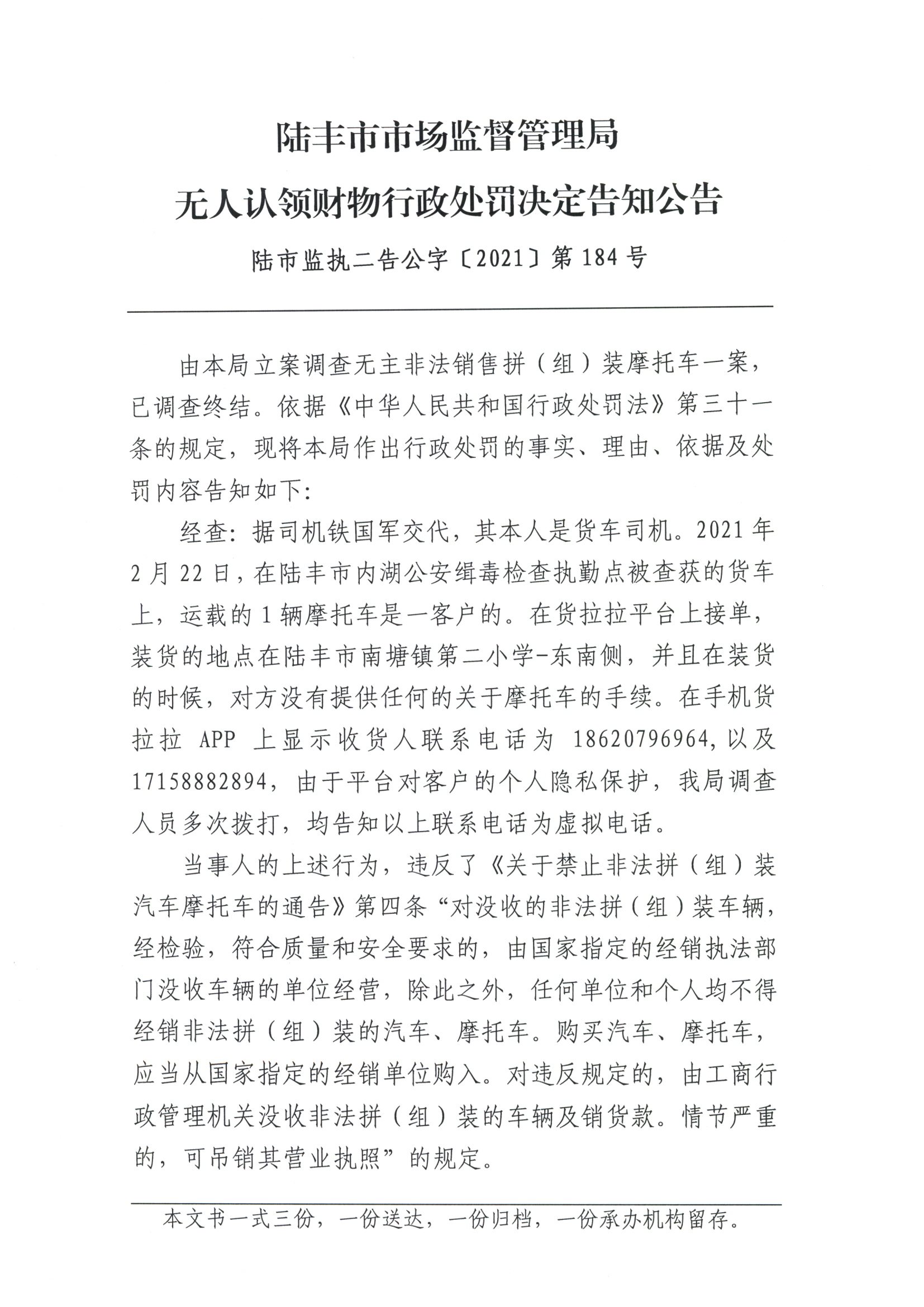 陸豐市市場(chǎng)監(jiān)督管理局無(wú)人認(rèn)領(lǐng)財(cái)物行政處罰決定告知公告
