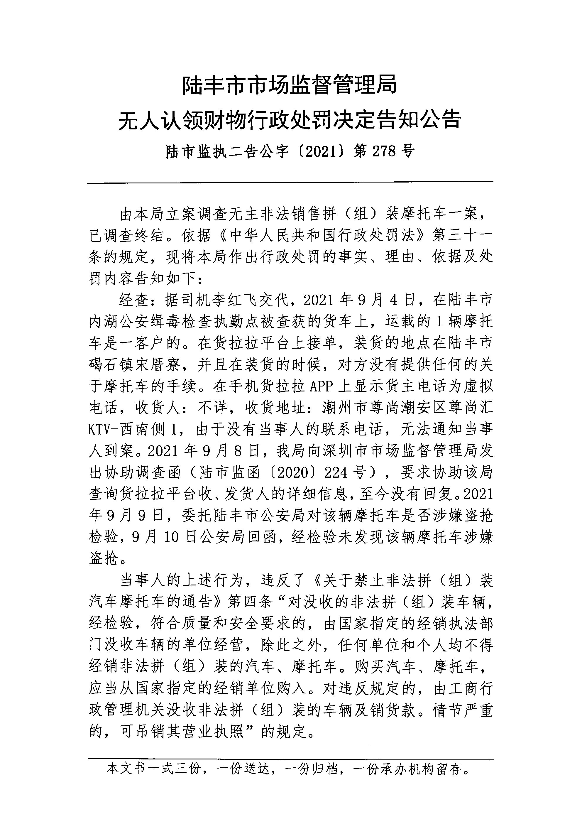 陸豐市市場監(jiān)督管理局無人認領(lǐng)財物行政處罰決定告知公告