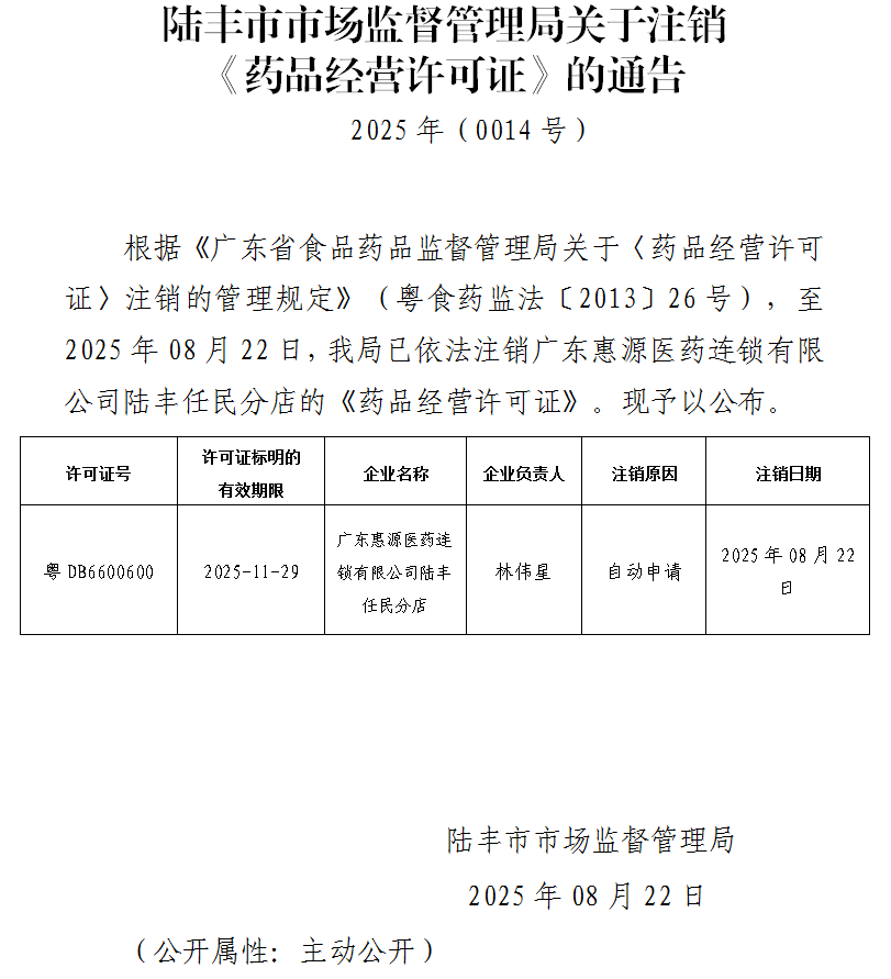 陸豐市市場(chǎng)監(jiān)督管理局關(guān)于注銷(xiāo)《藥品經(jīng)營(yíng)許可證》的通告