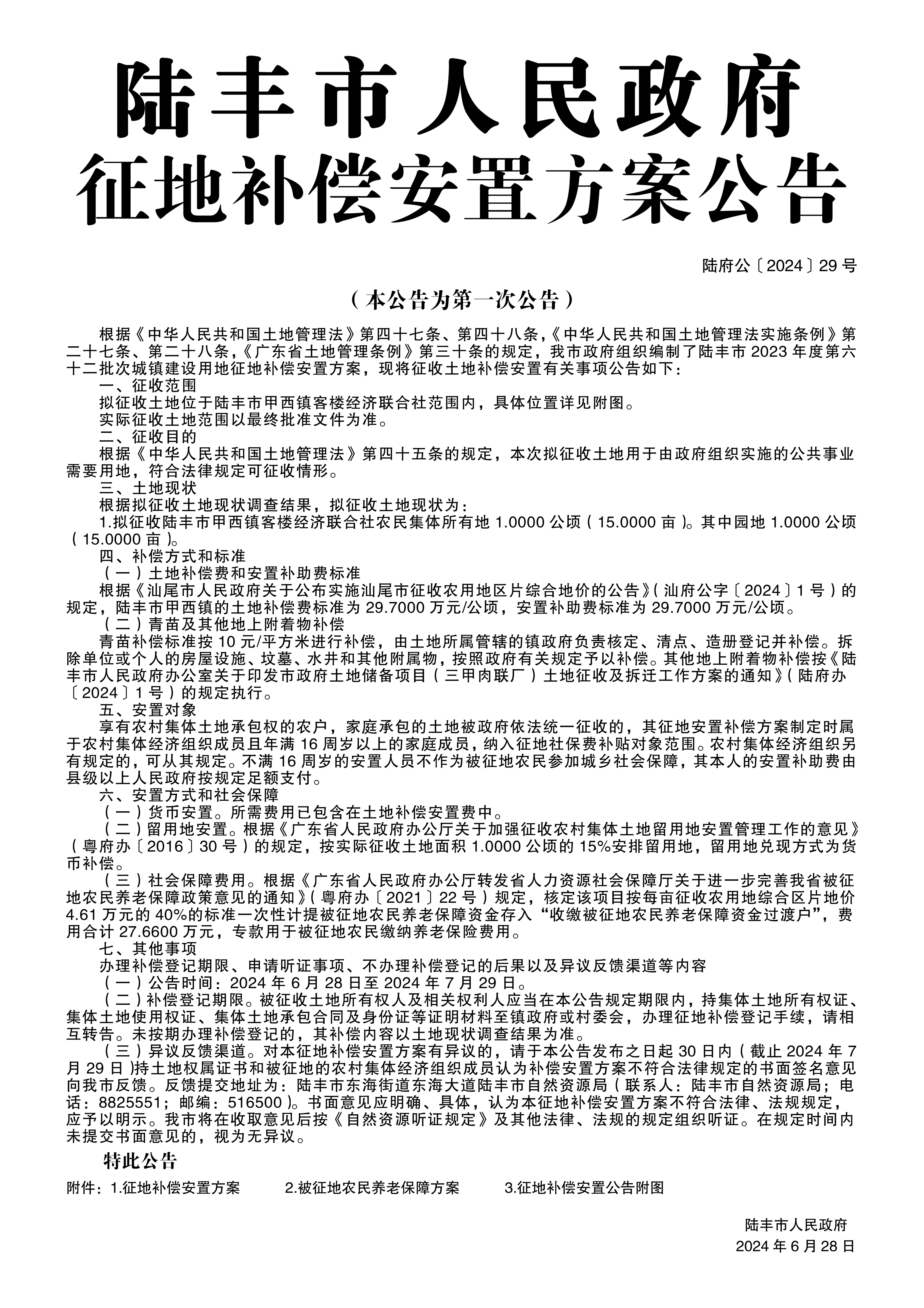 陸豐市人民政府征地補償安置方案公告(陸府公〔2024〕29號)