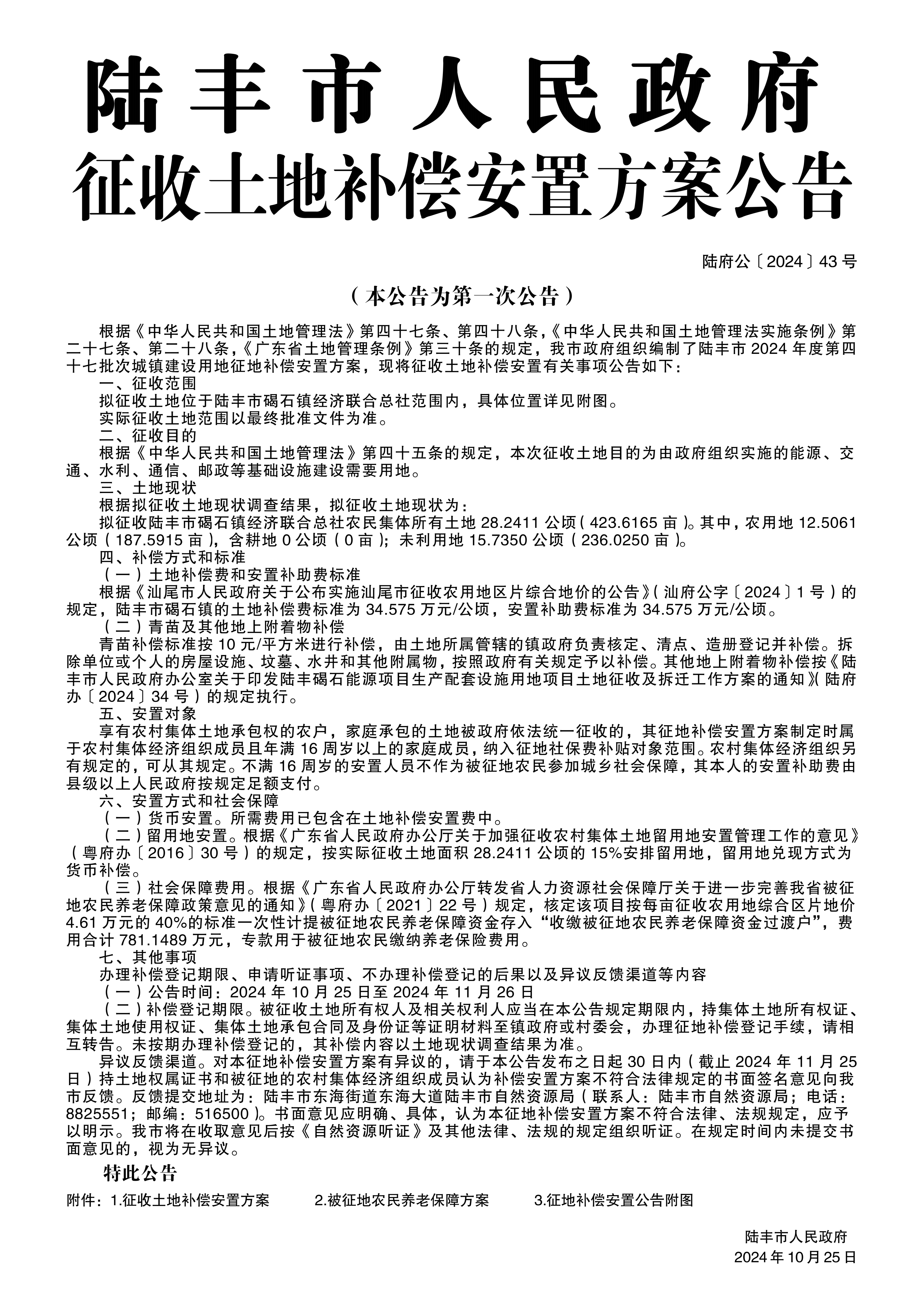 陸豐市人民政府關(guān)于征收土地補(bǔ)償安置方案的公告(陸府公〔2024〕43號(hào))