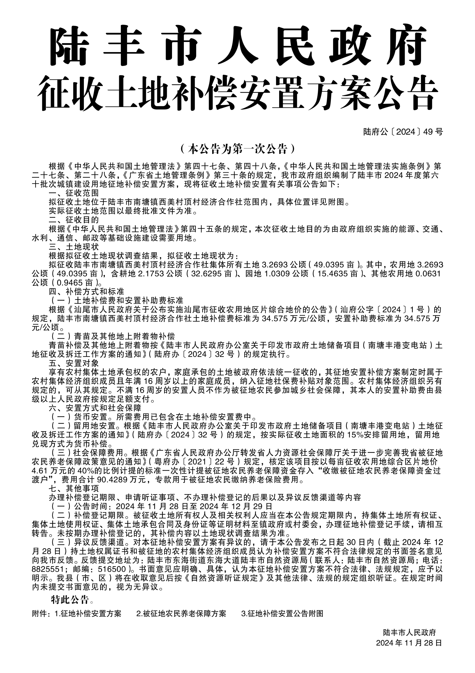 陸豐市人民政府關(guān)于征收土地補償安置方案的公告(陸府公〔2024〕49號)