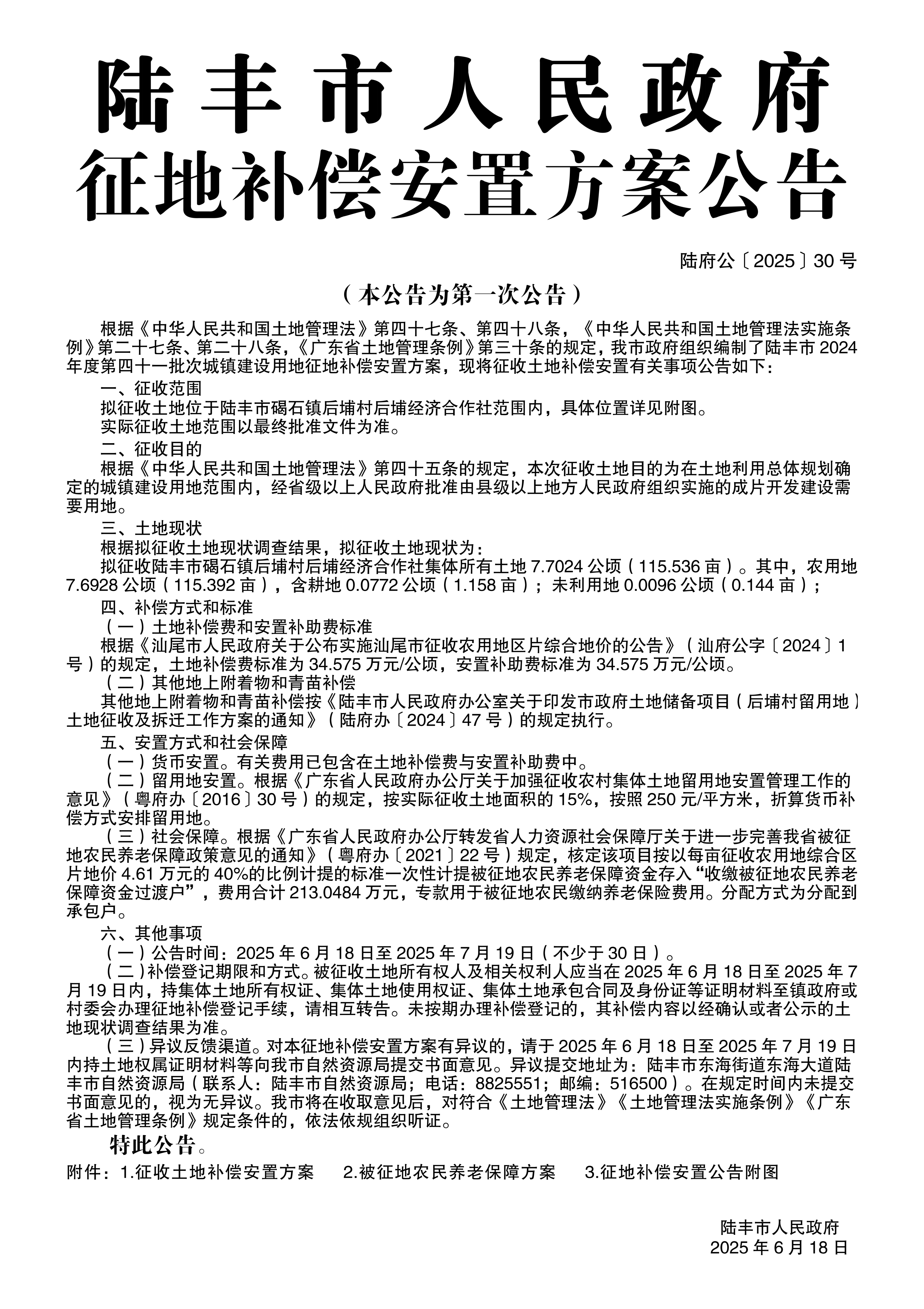 陸豐市人民政府土地補(bǔ)償安置方案公告(陸府公〔2025〕30號(hào))