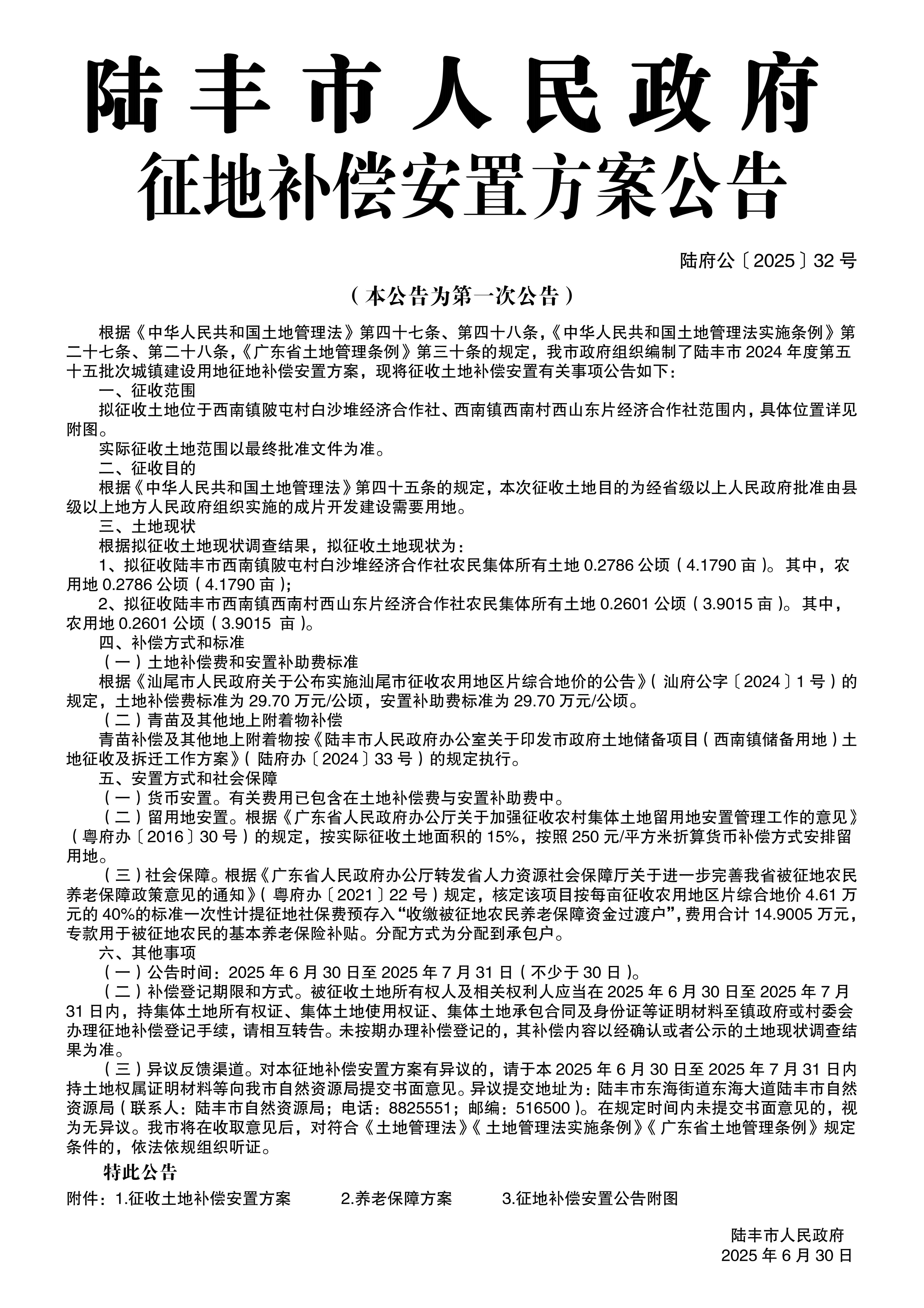陸豐市人民政府土地補償安置方案公告(陸府公〔2025〕32號)