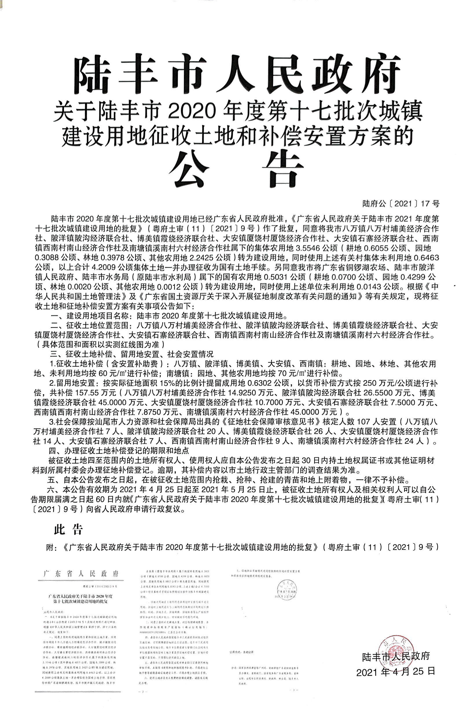 廣東省人民政府關(guān)于陸豐市2020年度第十七批次城鎮(zhèn)建設(shè)用地的批復(fù)(粵府土審(11)〔2021〕9號(hào))