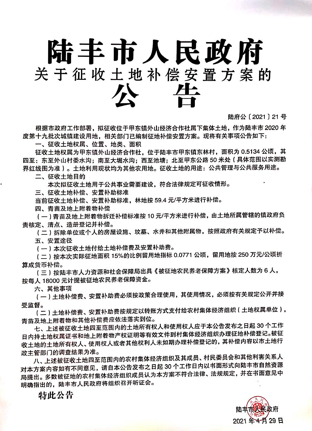 陸豐市人民政府關(guān)于征收土地補(bǔ)償安置方案的公告(陸府公[2021]21號)