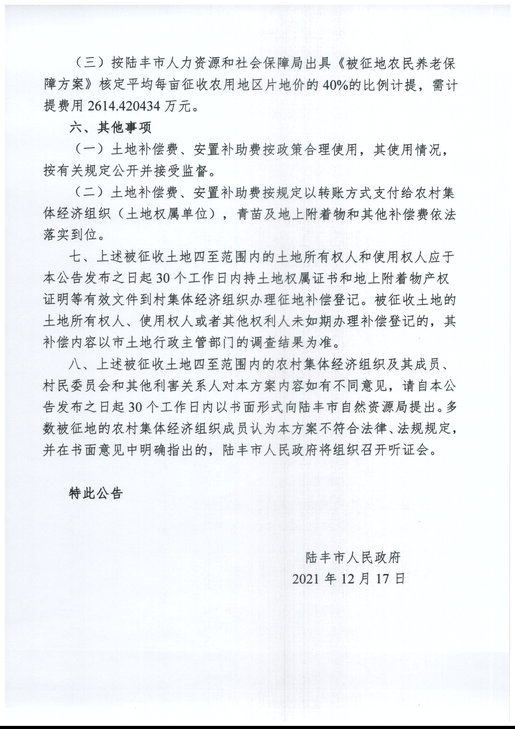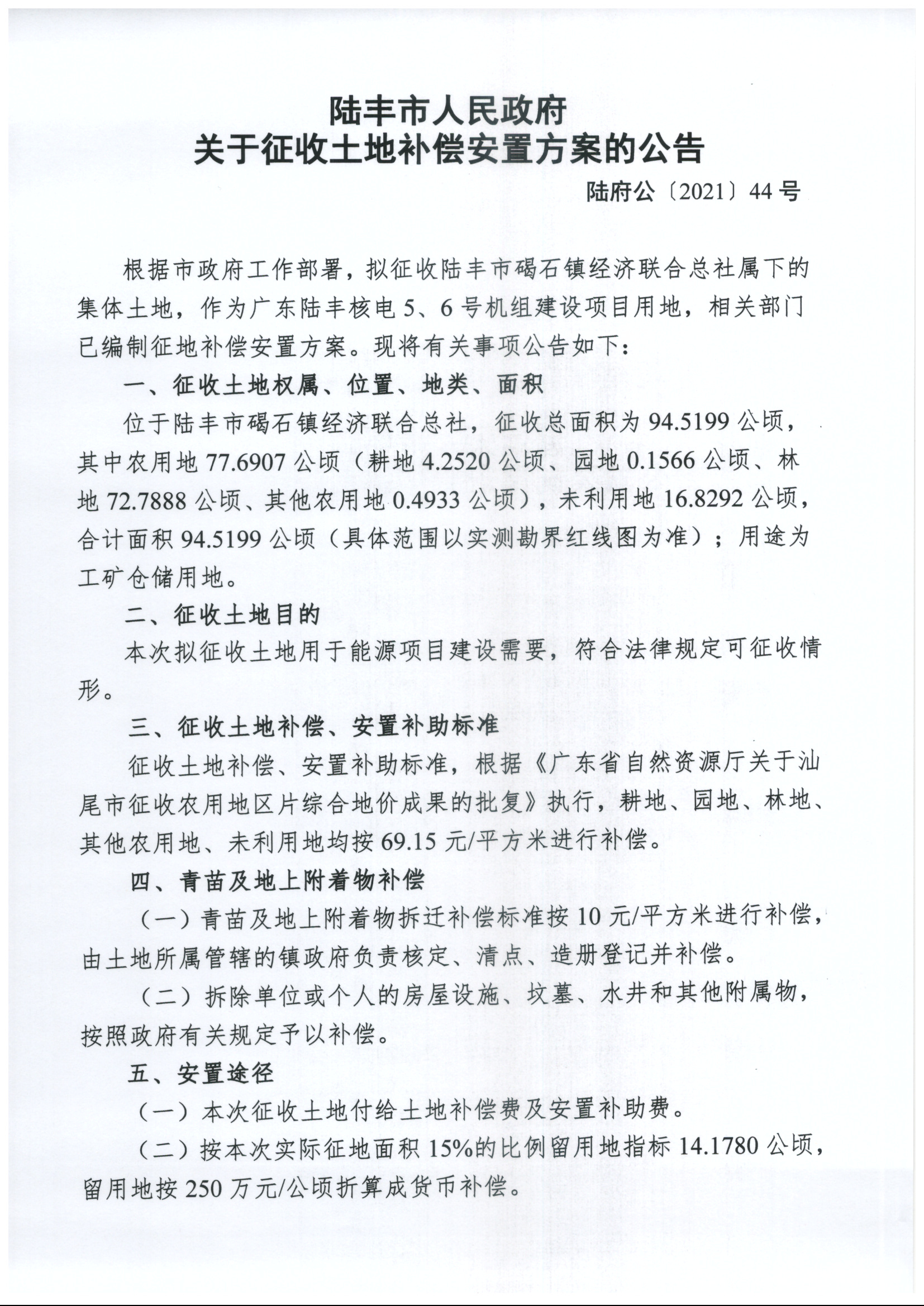陸豐市人民政府關(guān)于征收土地補(bǔ)償安置方案的公告(陸府公〔2021〕44號)
