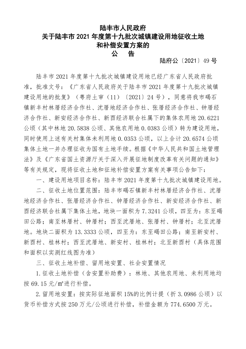 廣東省人民政府關(guān)于陸豐市2021年度第十九批次城鎮(zhèn)建設(shè)用地的批復(fù)(粵府土審(11)〔2021〕24號)