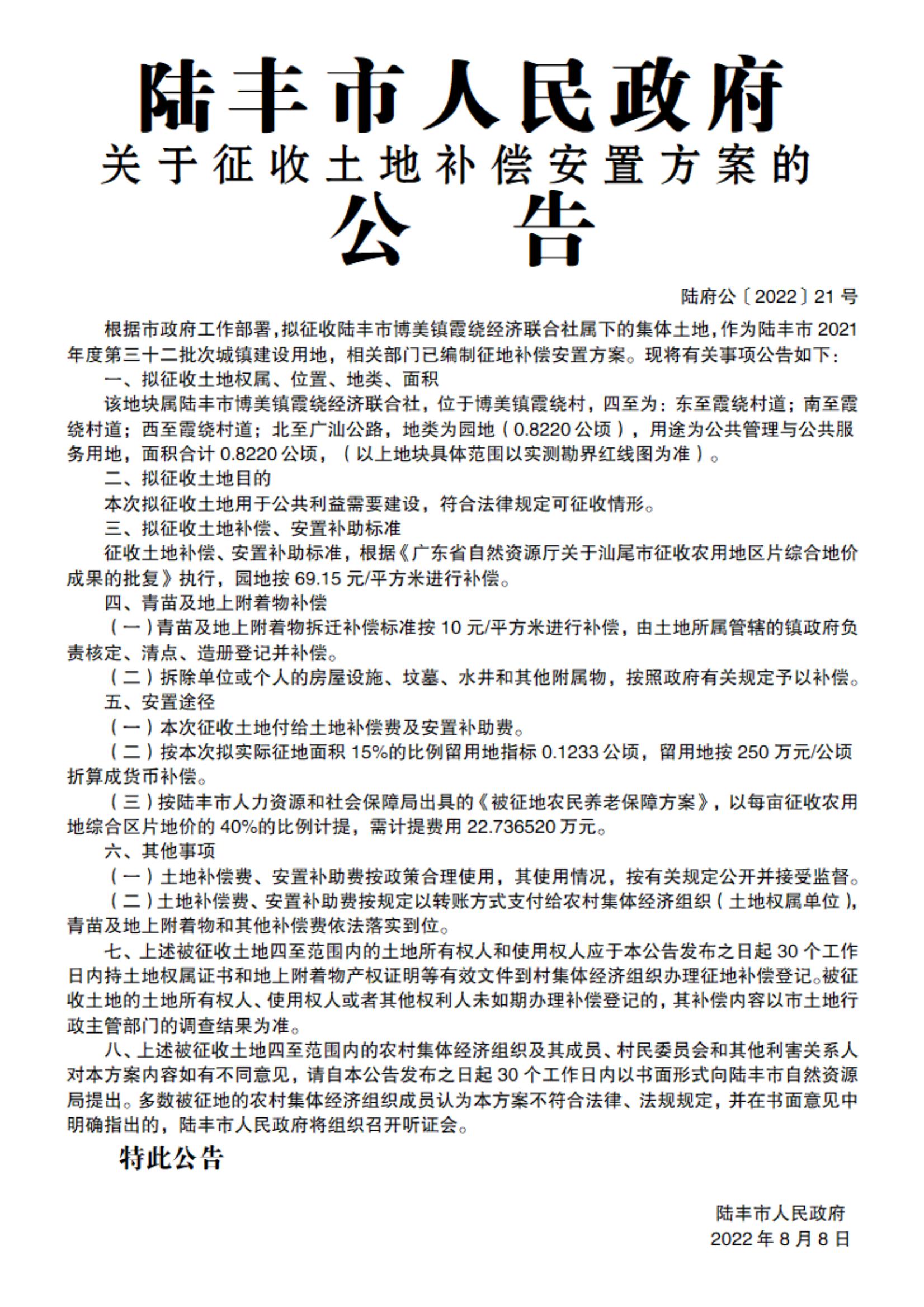陸豐市人民政府關(guān)于征收土地補(bǔ)償安置方案的公告(陸府公[2022]21號(hào))
