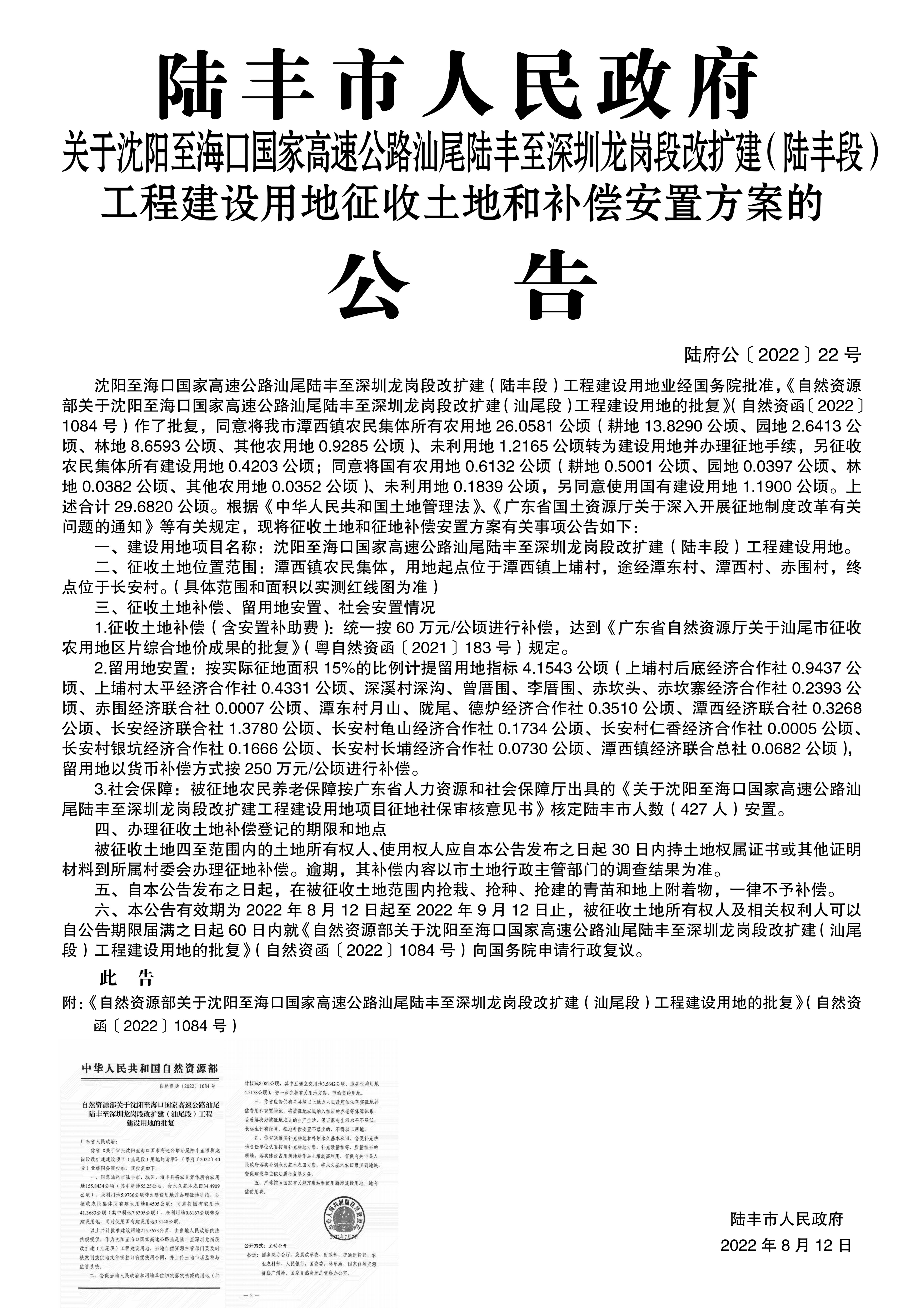 陸豐市人民政府關(guān)于沈陽至海口國家高速公路汕尾陸豐至深圳龍崗段改擴(kuò)建(陸豐段)工程建設(shè)用地征收土地和補(bǔ)償安置方案的公告(陸府公〔2022〕22號)