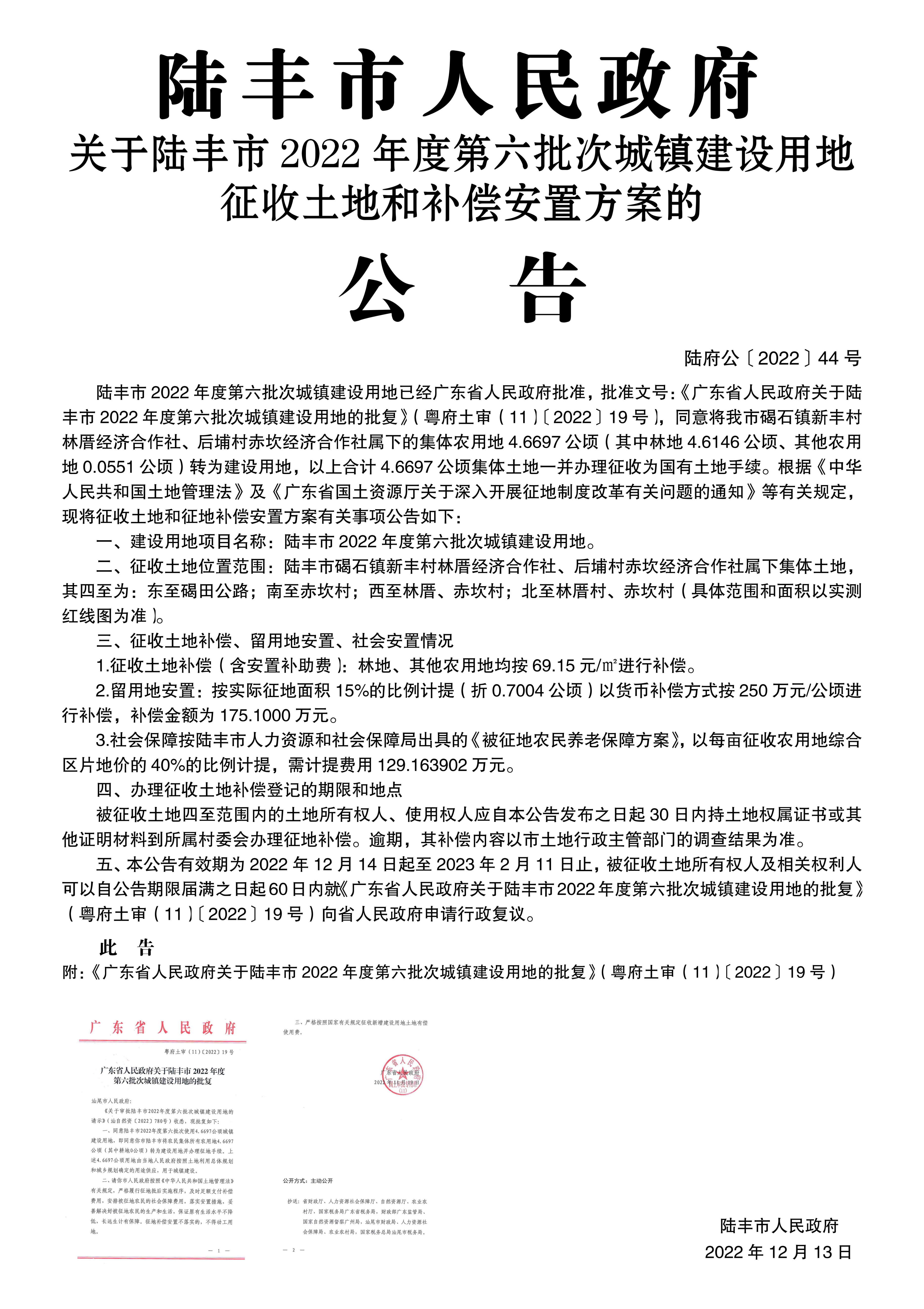 廣東省人民政府關(guān)于陸豐市 2022年度第六批次城鎮(zhèn)建設(shè)用地的批復(fù)(粵府土審(11)〔2022〕19號(hào))