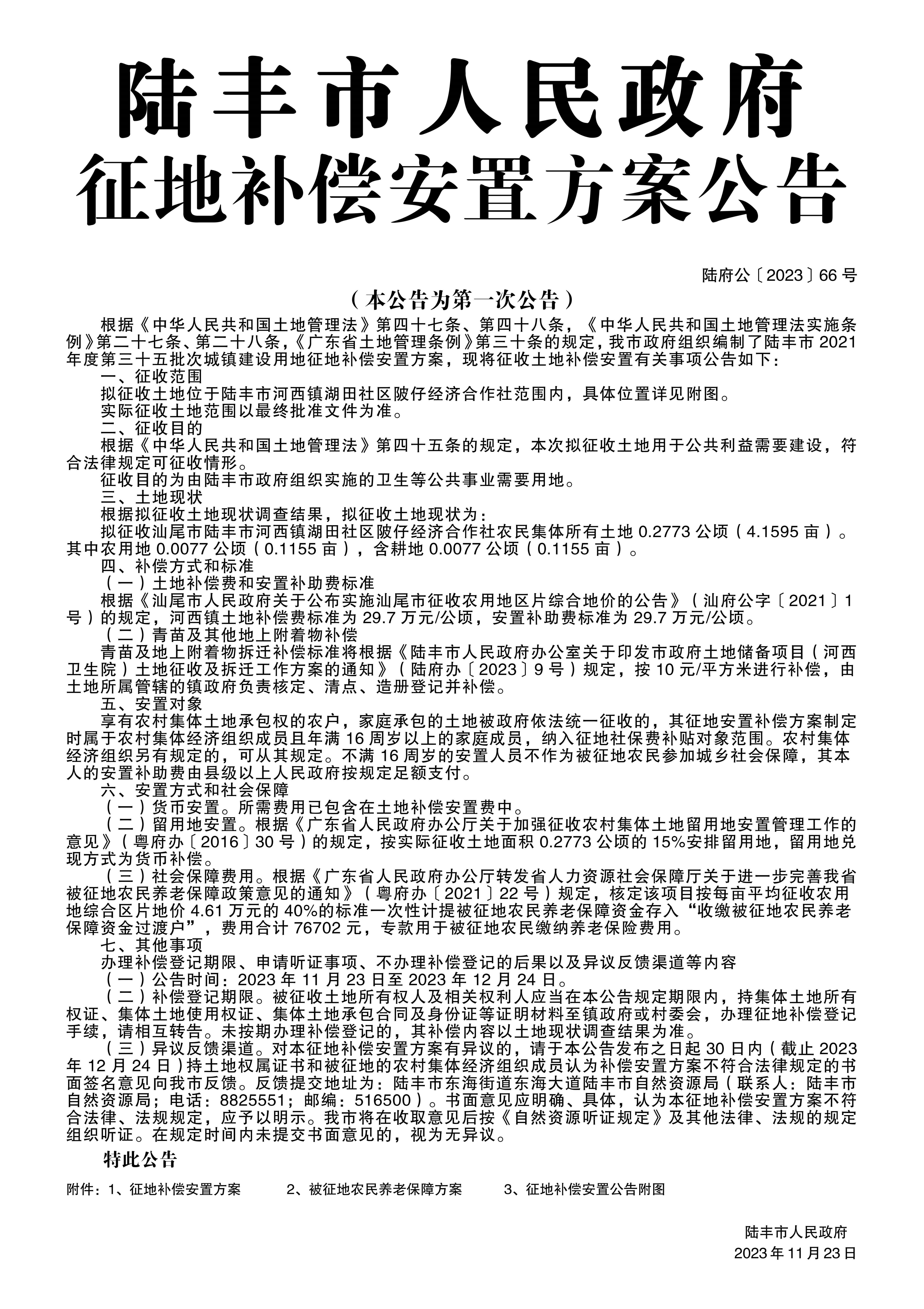 陸豐市人民政府關(guān)于征收土地補(bǔ)償安置方案的公告(陸府公〔2023〕66號(hào))