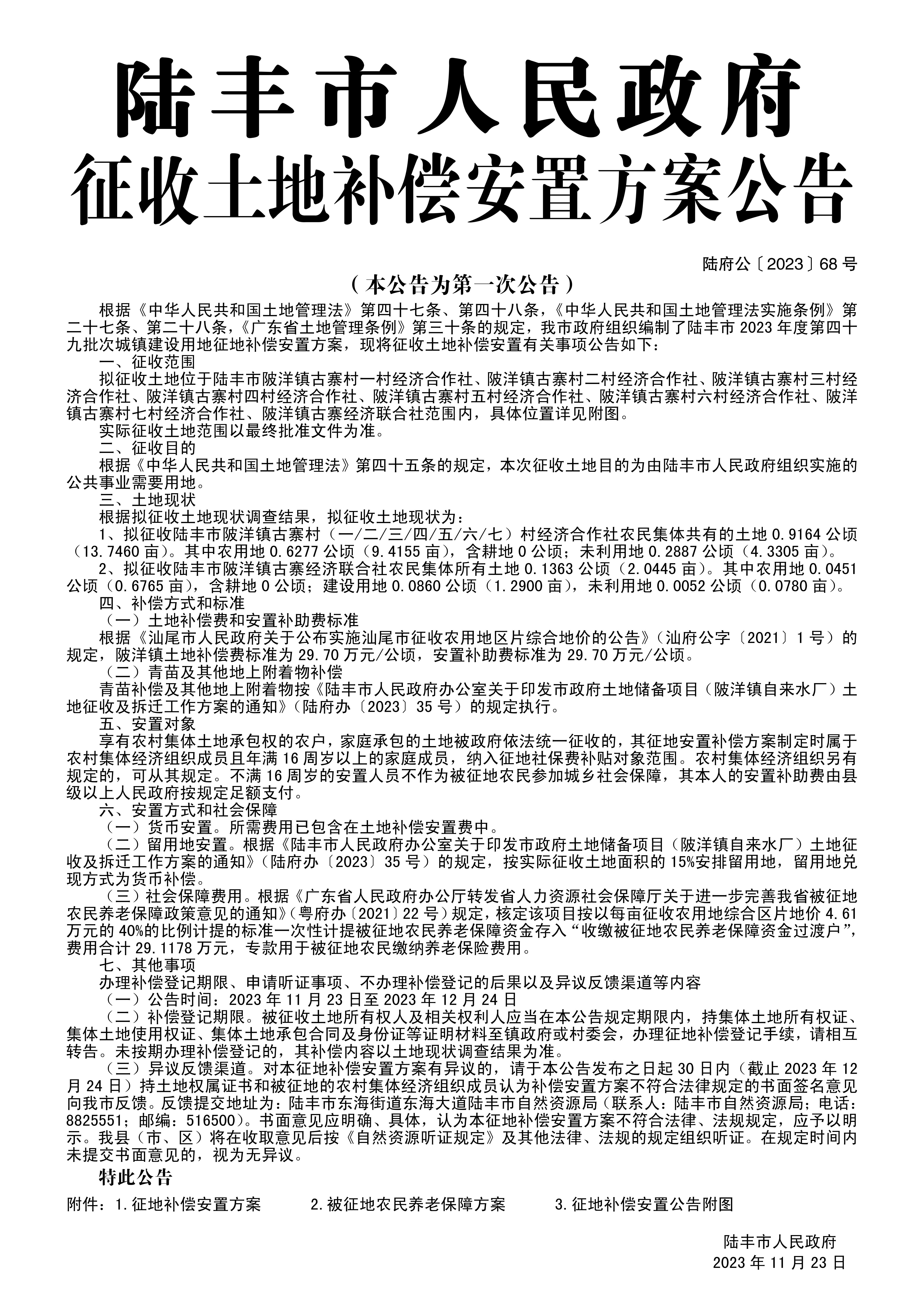 陸豐市人民政府關(guān)于征收土地補償安置方案的公告(陸府公〔2023〕68號)
