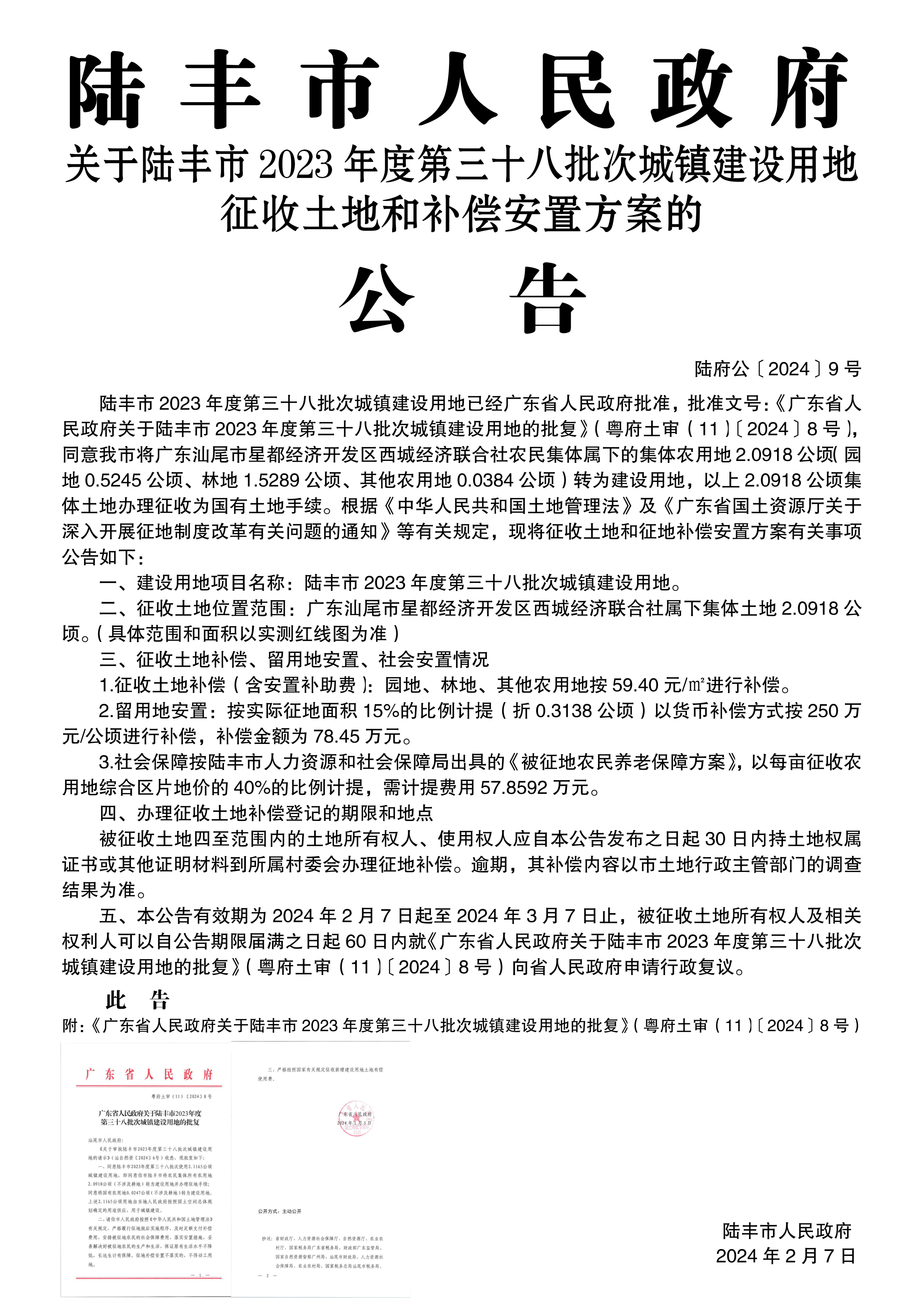 廣東省人民政府關(guān)于陸豐市 2023年度第三十八批次城鎮(zhèn)建設(shè)用地的批復(粵府土審(11)〔2024〕8號)