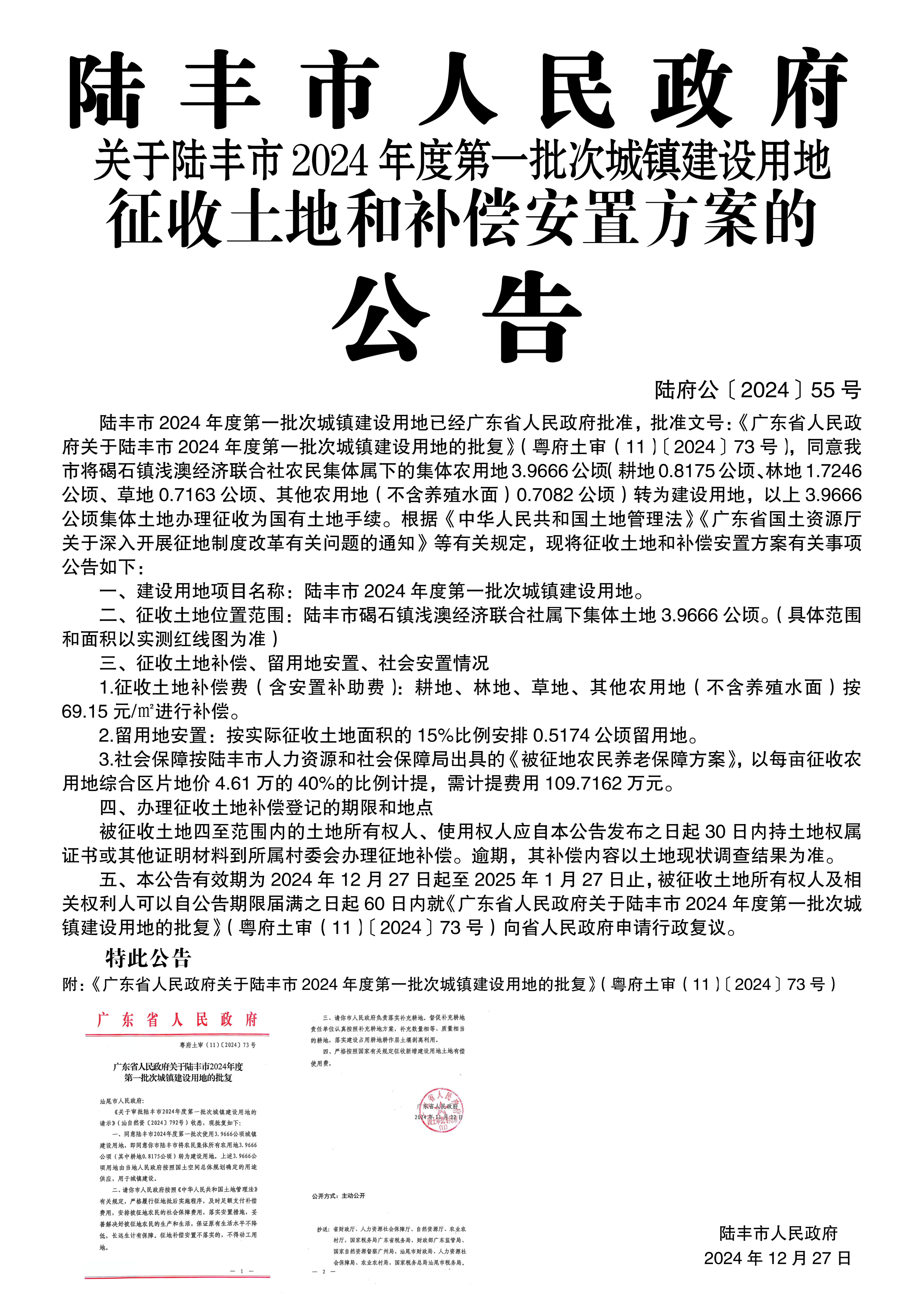 廣東省人民政府關(guān)于陸豐市 2024年度第一批次城鎮(zhèn)建設(shè)用地的批復(fù)(粵府土審(11)〔2024〕73 號)