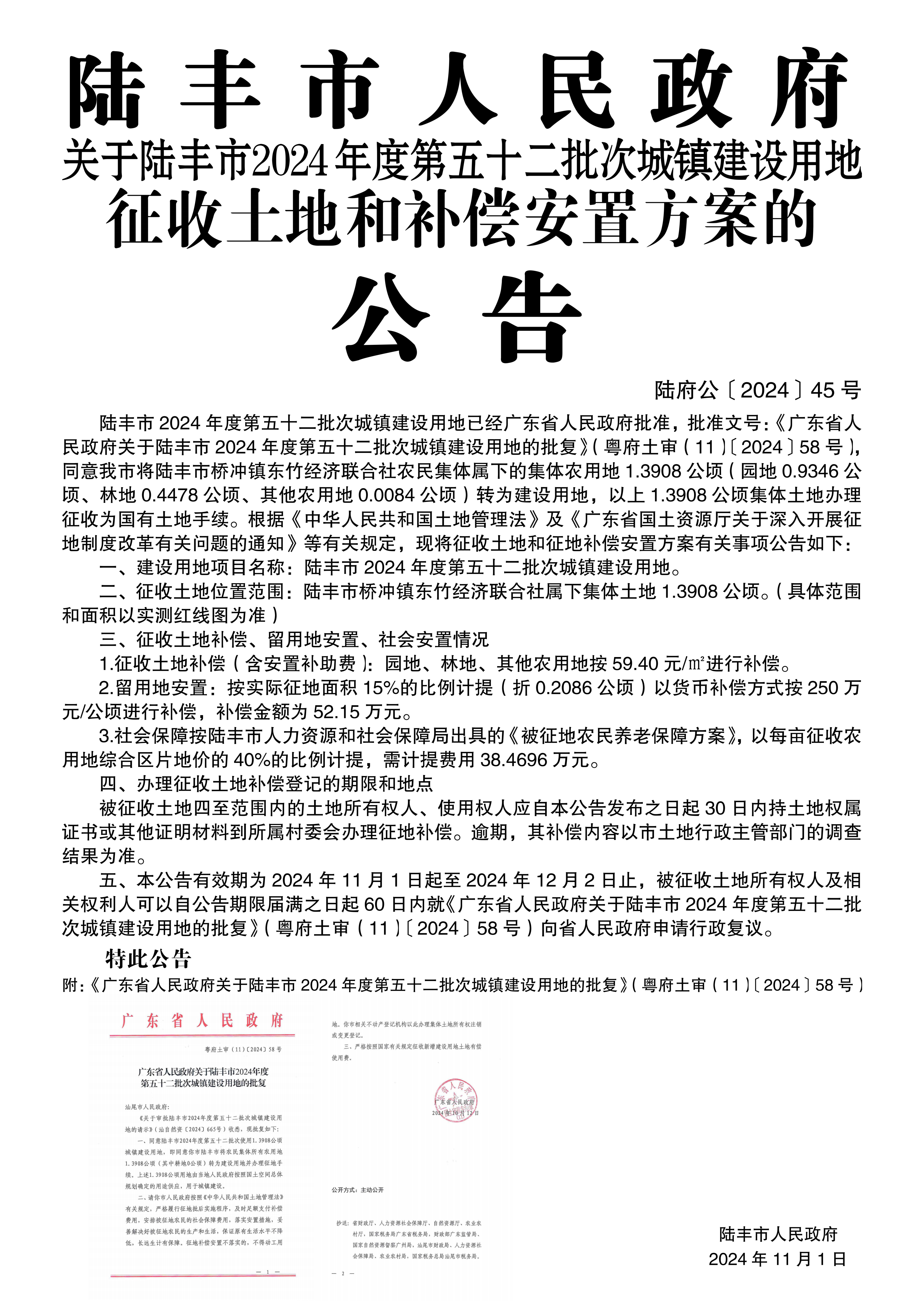 廣東省人民政府關(guān)于陸豐市 2024年度第五十二批次城鎮(zhèn)建設(shè)用地的批復(粵府土審(11)〔2024〕58號)