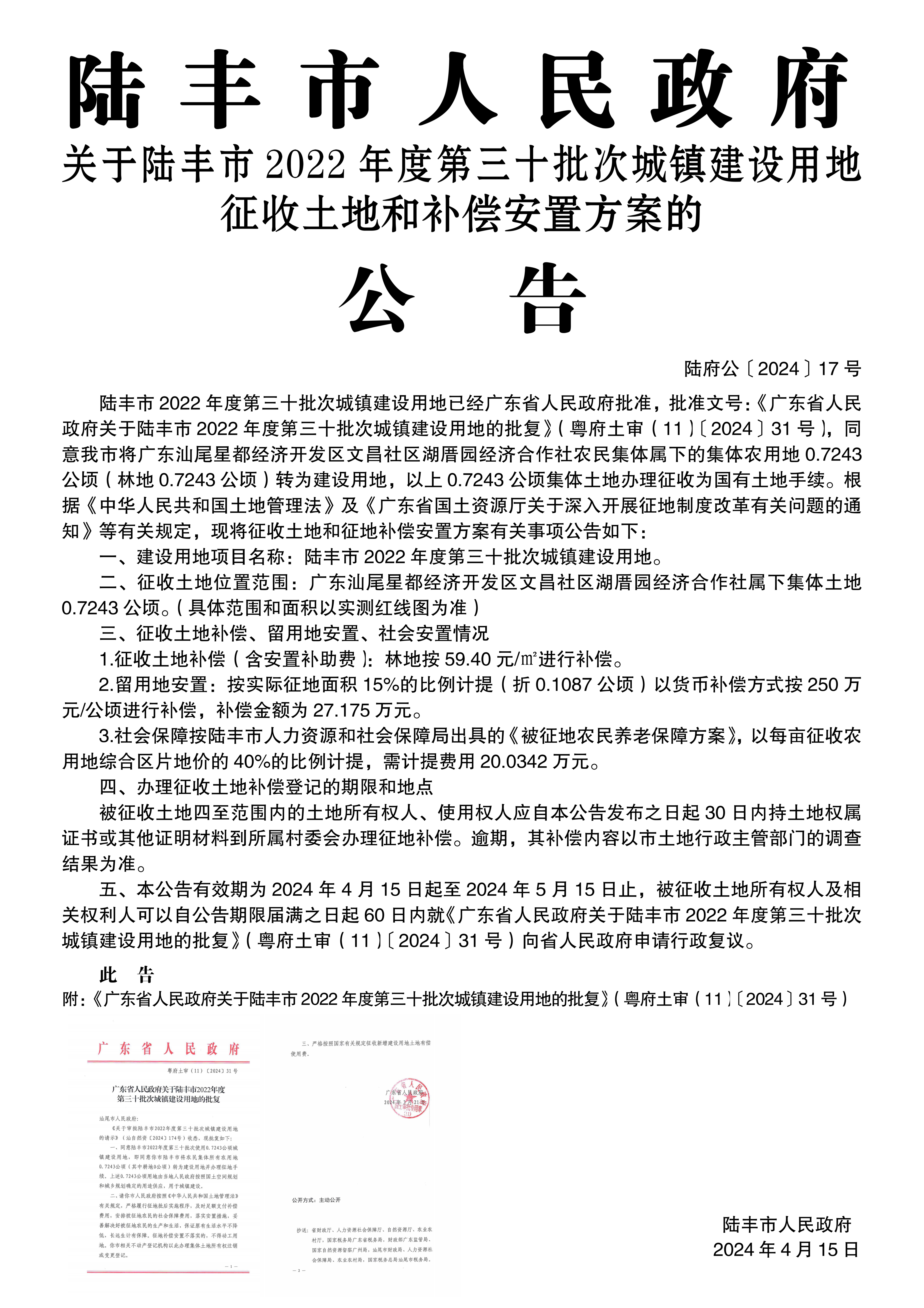 廣東省人民政府關(guān)于陸豐市 2022年度第三十批次城鎮(zhèn)建設(shè)用地的批復(fù)(粵府土審(11)〔2024〕31號)