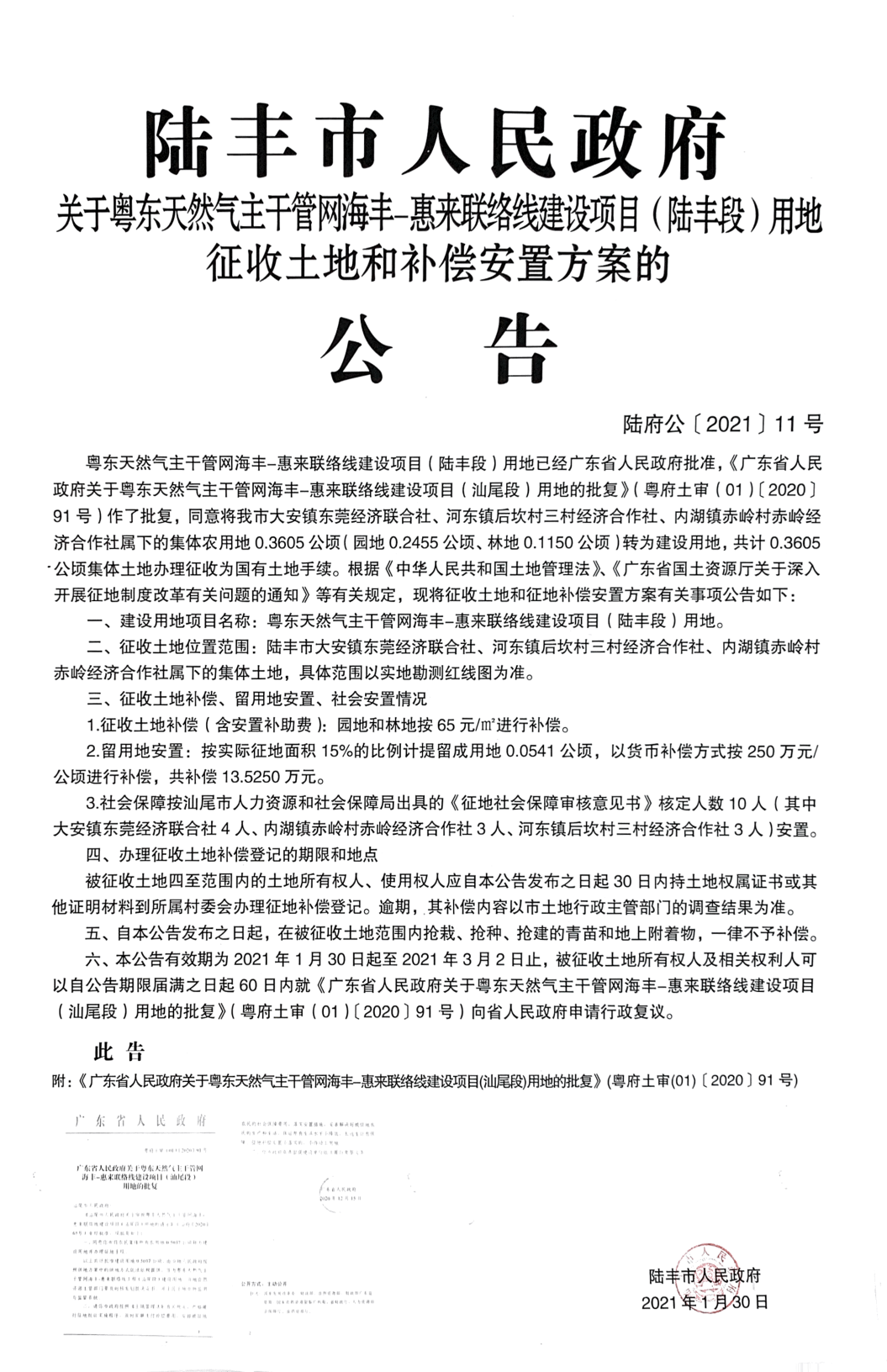 廣東省人民政府關(guān)于粵東天然氣主干管網(wǎng)海豐-惠來聯(lián)絡(luò)線建設(shè)項(xiàng)目(汕尾段)用地的批復(fù)(粵府土審(01)〔2020〕91 號)