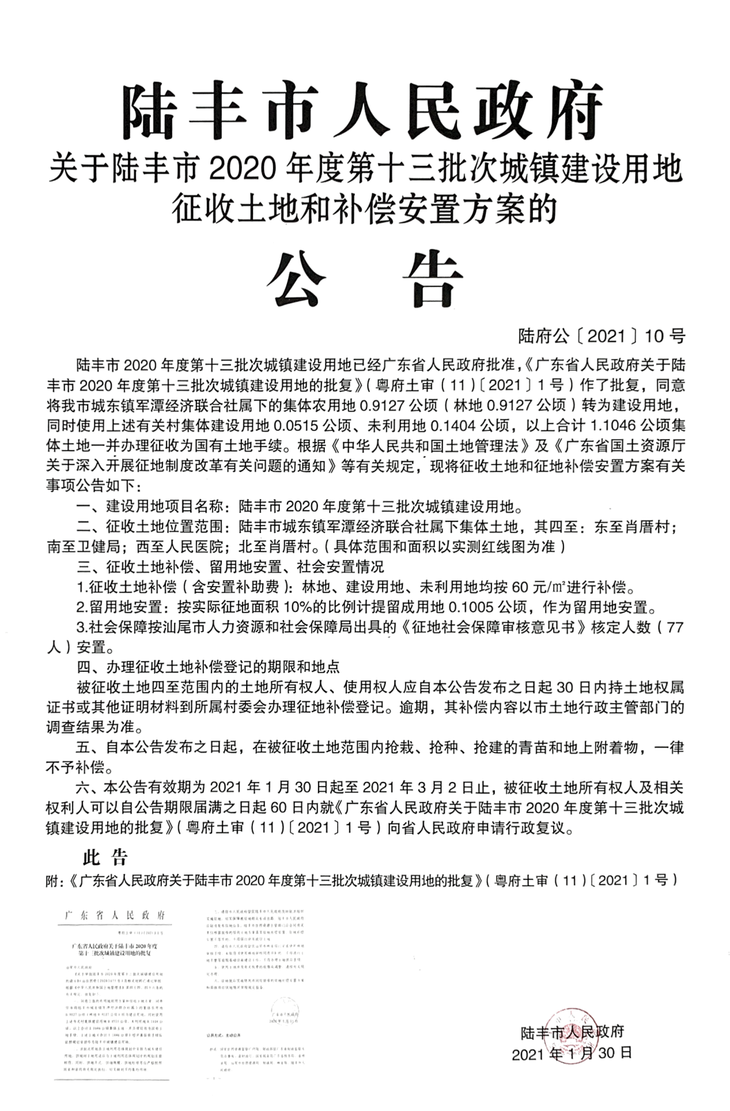 廣東省人民政府關(guān)于陸豐市2020年度第十三批次城鎮(zhèn)建設(shè)用地的批復(fù)(粵府土審(11)〔2021〕1號)