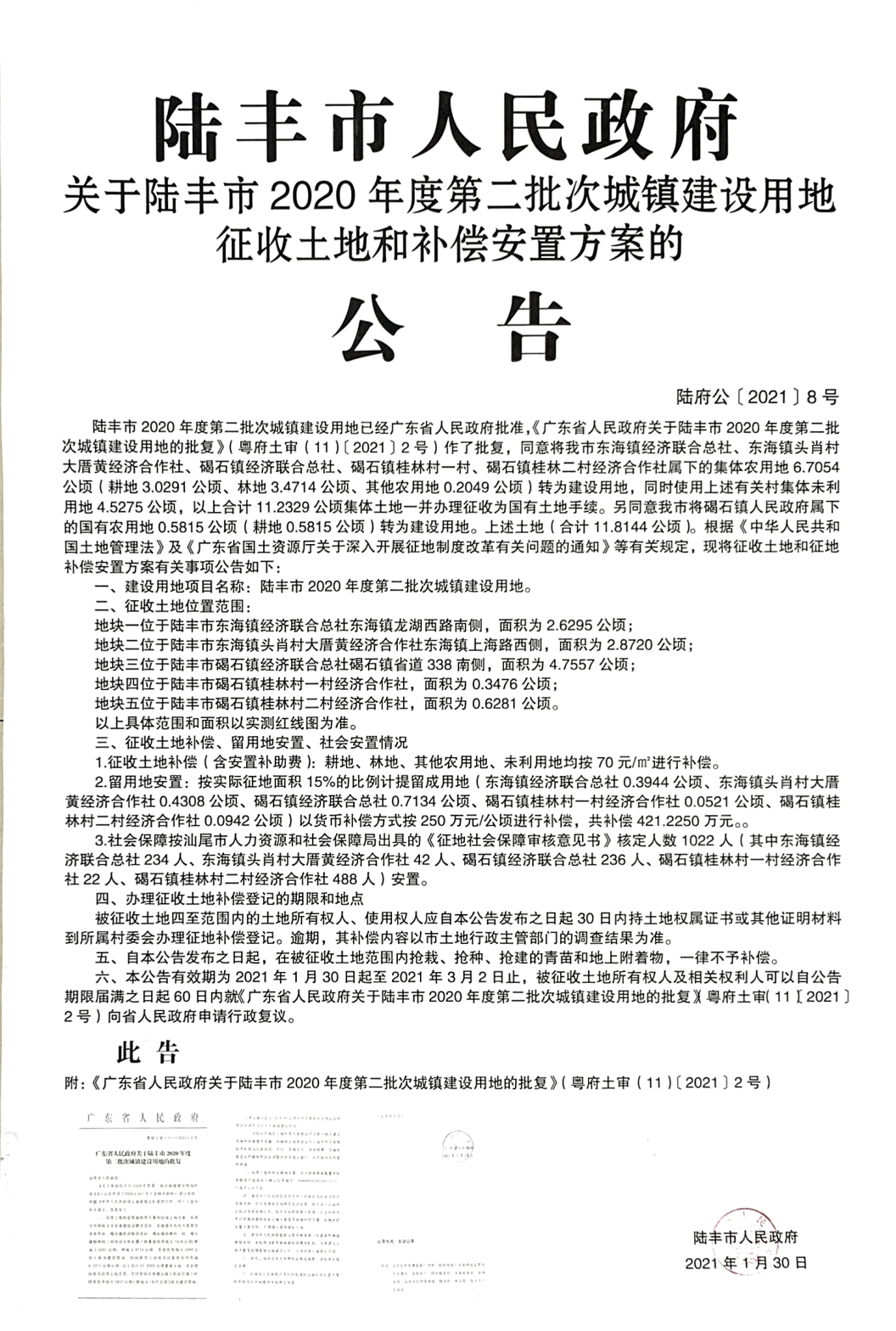 廣東省人民政府關(guān)于陸豐市2020年度第二批次城鎮(zhèn)建設(shè)用地的批復(fù)(粵府土審(11)〔2021〕2號(hào))
