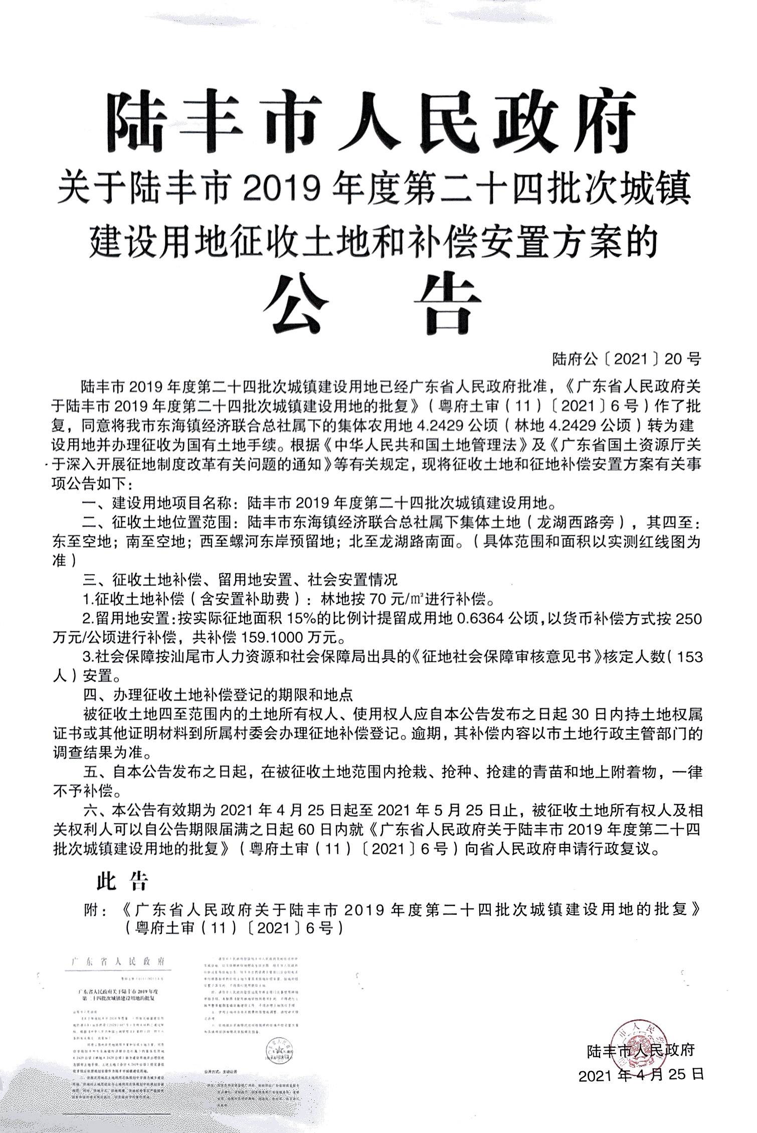 廣東省人民政府關(guān)于陸豐市2019年度第二十四批次城鎮(zhèn)建設(shè)用地的批復(fù)(粵府土審(11)〔2021〕6號)