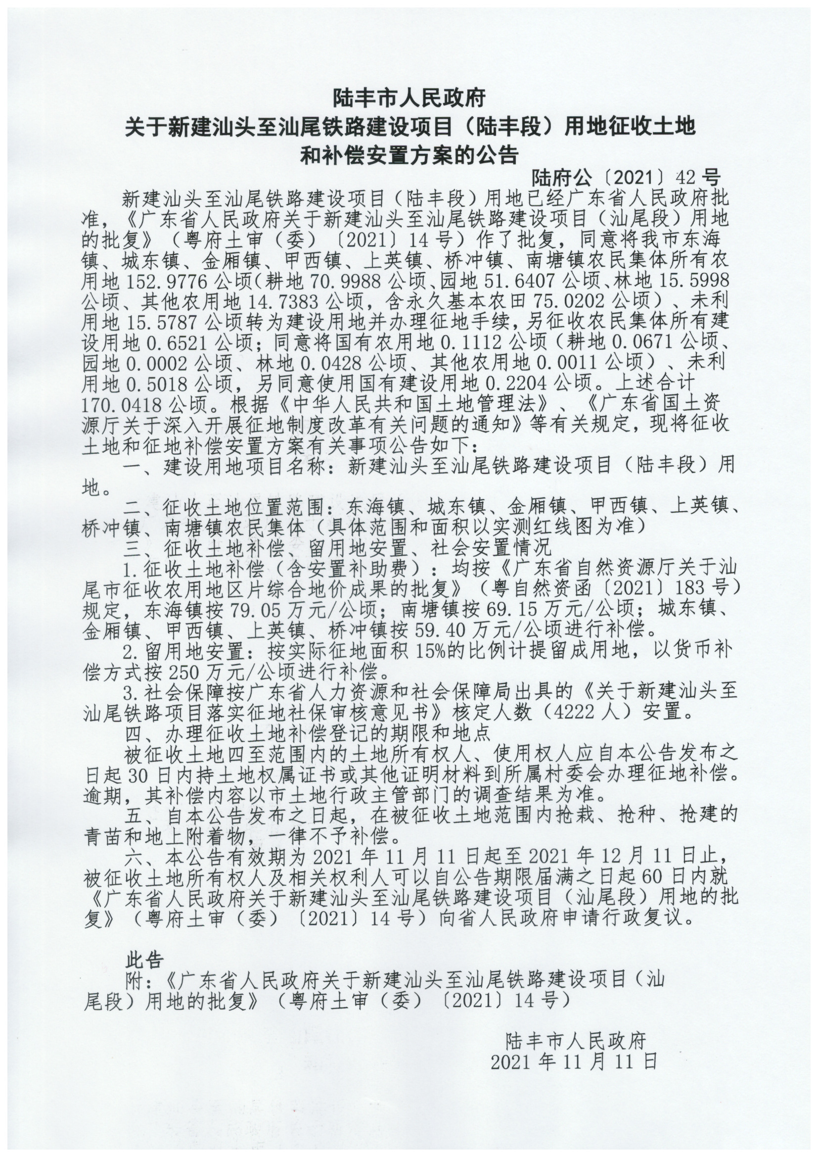 廣東省人民政府關(guān)于新建汕頭至汕尾鐵路建設(shè)項(xiàng)目(汕尾段)用地的批復(fù)(粵府土審(委)〔2021〕14號)