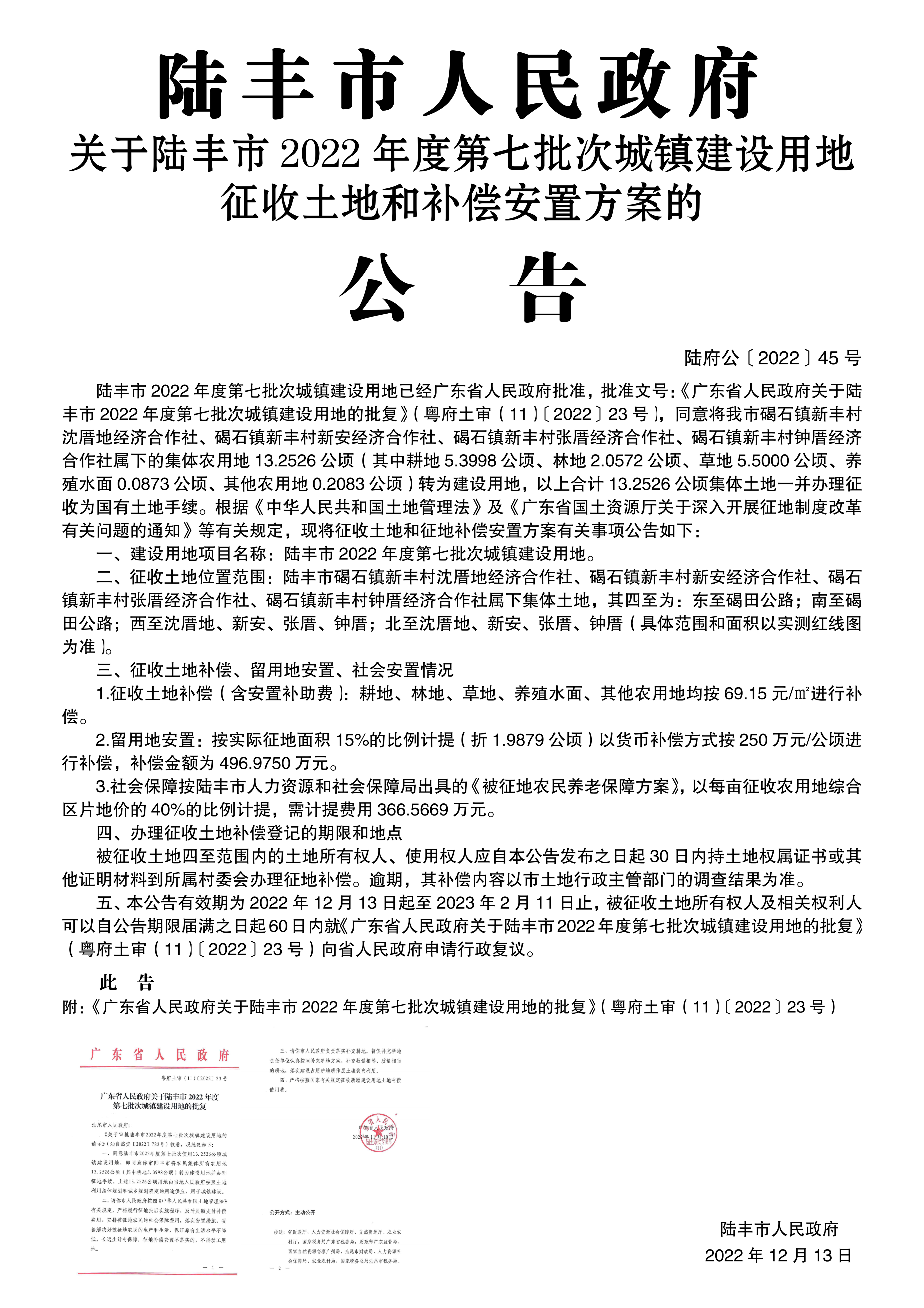 廣東省人民政府關(guān)于陸豐市2022年度第七批次城鎮(zhèn)建設(shè)用地的批復(fù)(粵府土審(11)〔2022〕23號)